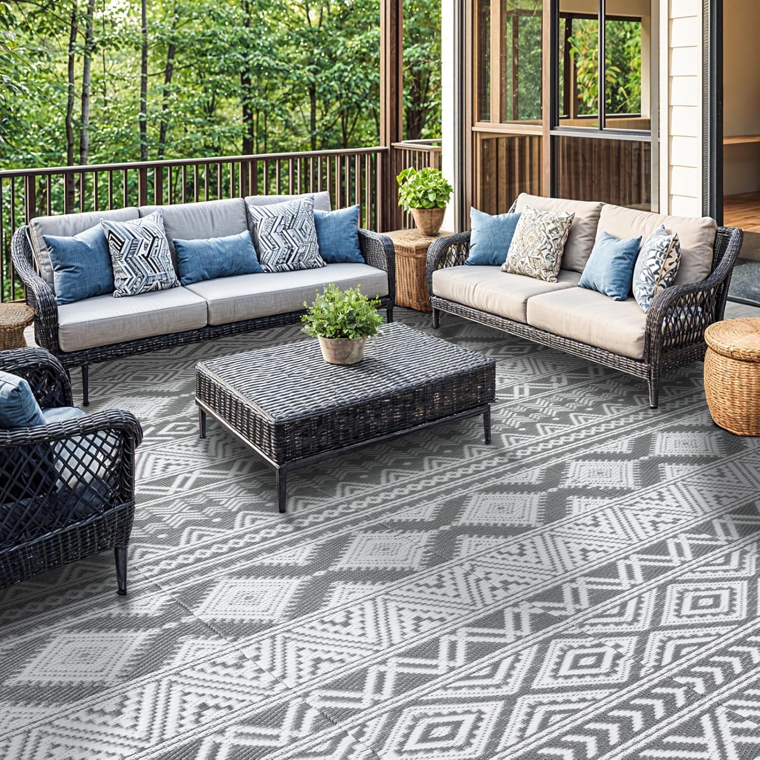8'x10' Reversible Outdoor Rug - Eco-Friendly Plastic Straw Rug-Heavy-Duty Waterproof Mat, UV & Fade Resistant for Patio, Camping, RV, Deck, Balcony(8x10,Gray&White)