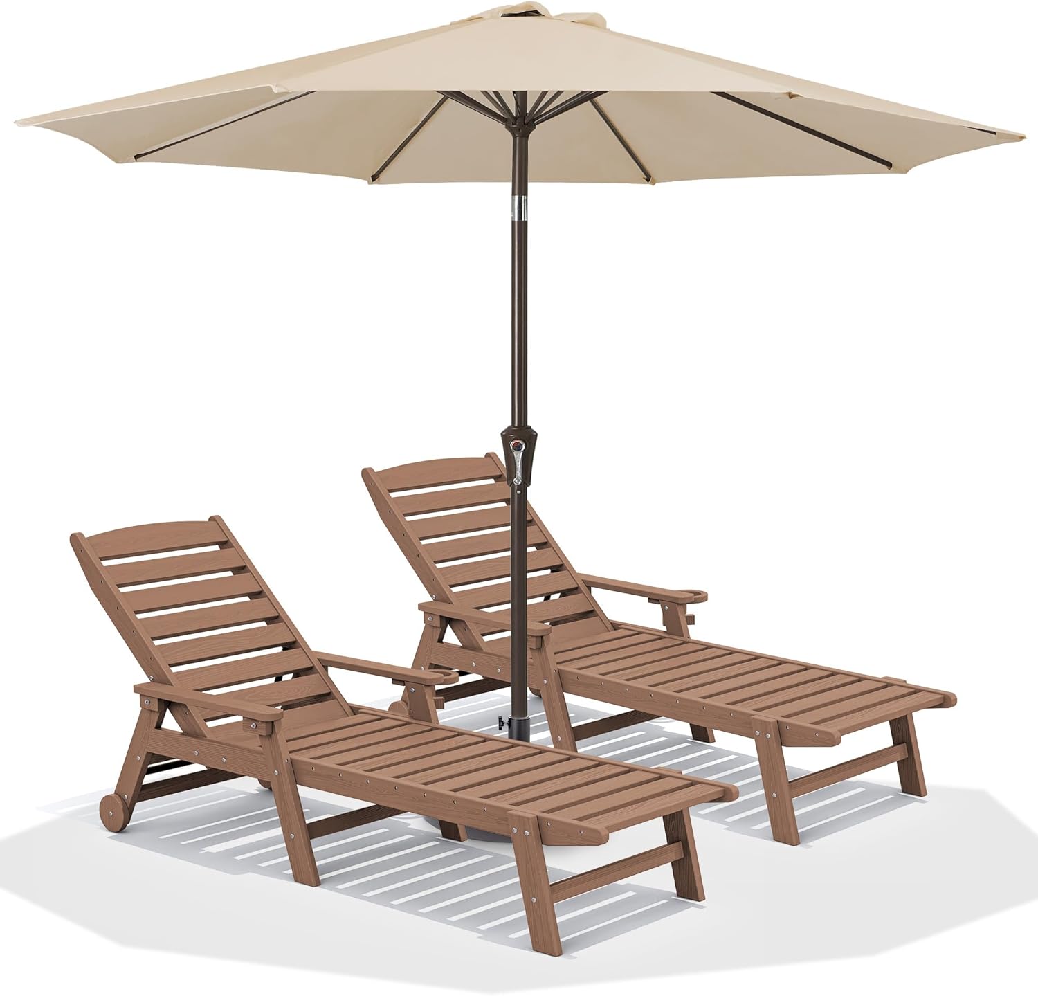 SERWALL Patio Chaise Lounge Chair Set of 2 with 9FT Patio Umbrella, 78'' HDPE Outdoor Lounger, Poly Lounge Chair with Rolling Wheels & Cup Holder for Pool,Wooden Brown (Umbreall Base not Included)