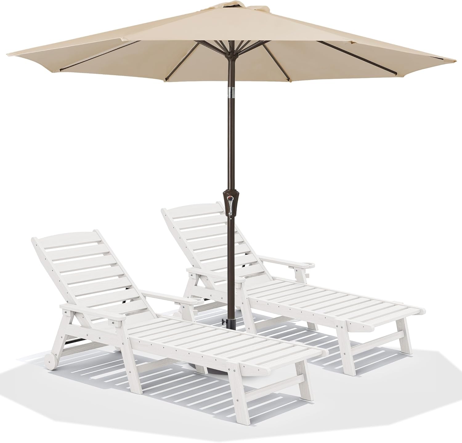 SERWALL Patio Chaise Lounge Chair Set of 2 with 9FT Patio Umbrella, 78'' HDPE Outdoor Lounger, Poly Lounge Chair with Rolling Wheels & Cup Holder for Pool,Light White (Umbreall Base not Included)