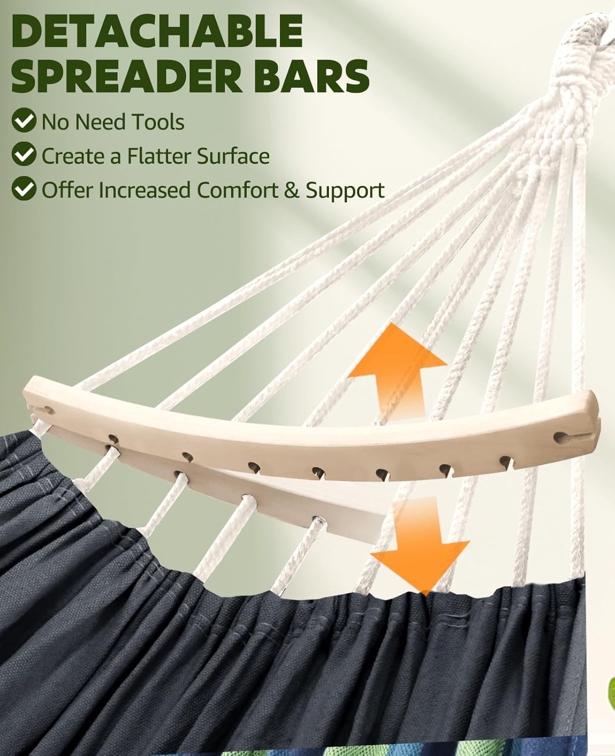 - Stability and Security:The spreader bars enhance stability, preventing excessive swaying or flipping,ensuring a secure and safe experience,especially when entering or exiting the hammock. With the included suspension system comprising two infinitely adjustable straps and two carabiners, you can easily and securely set up the hammock,promoting safe and enjoyable lounging.The suspension system's carabiners further enhance safety by offering reliable and secure attachment points.