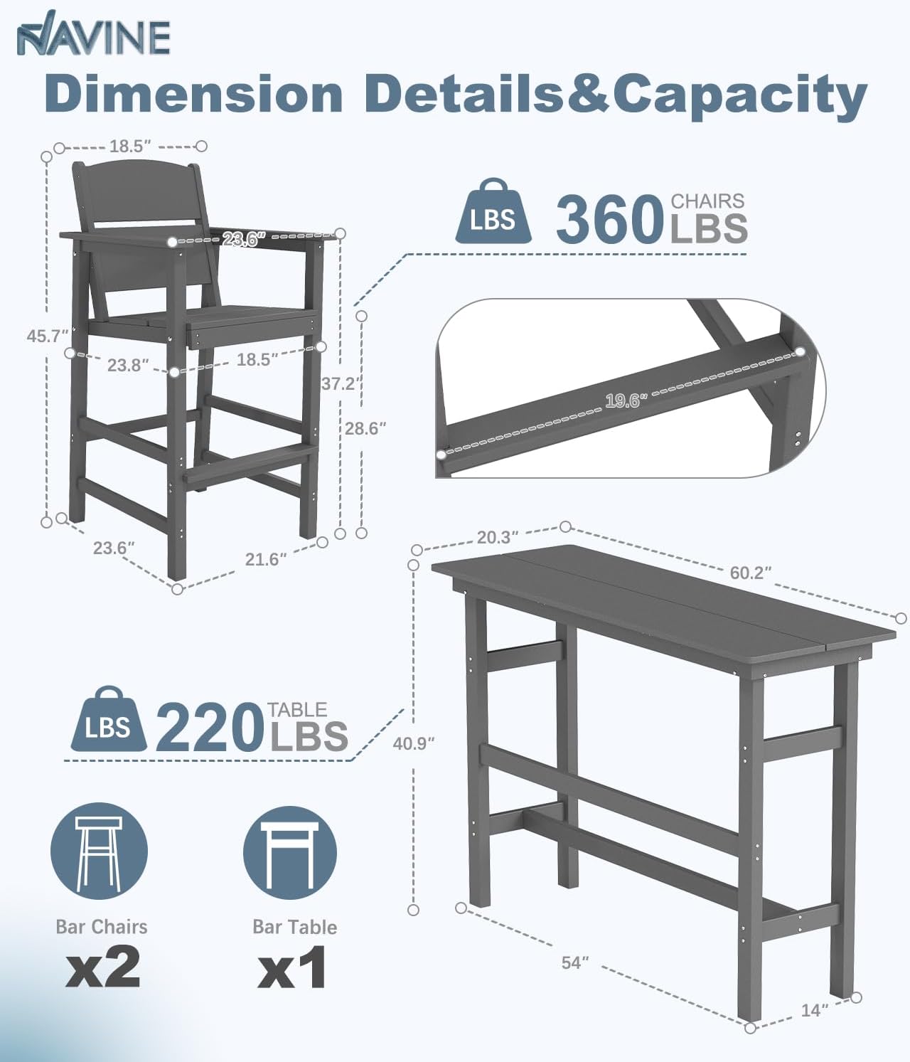 - Complete 3-Piece Bar Set: Includes 1 piece high-top patio table (60.2"L x 20.3"W x 40.9"H) and 2 pieces matching Adirondack bar chairs (23.6"W x 23.6"D x 45.7"H). Engineered heights provide optimal comfort and a wide view. Each chair holds 350 lbs, the table supports 220 lbs.