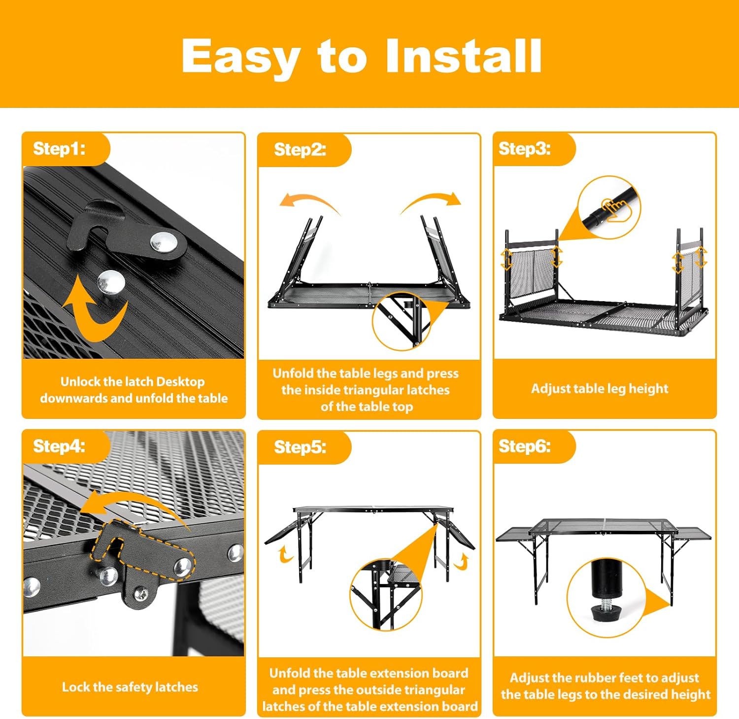 - Foldable Table Extension Boards - 1. Add individual 2 support rods for the extension board - Effectively Reducing extension board deformation by 30%. 2 Increase the area of the extension board by 10% - We add a connecting rod at the junction of the extension board and table legs to increase the usable area. If you need more space to place seasonings, food, snacks, drinks, you can open the extension board to get more space for use ( 5.7 FT). If you want to reduce the usable area, you can also fold the table up to 4 FT