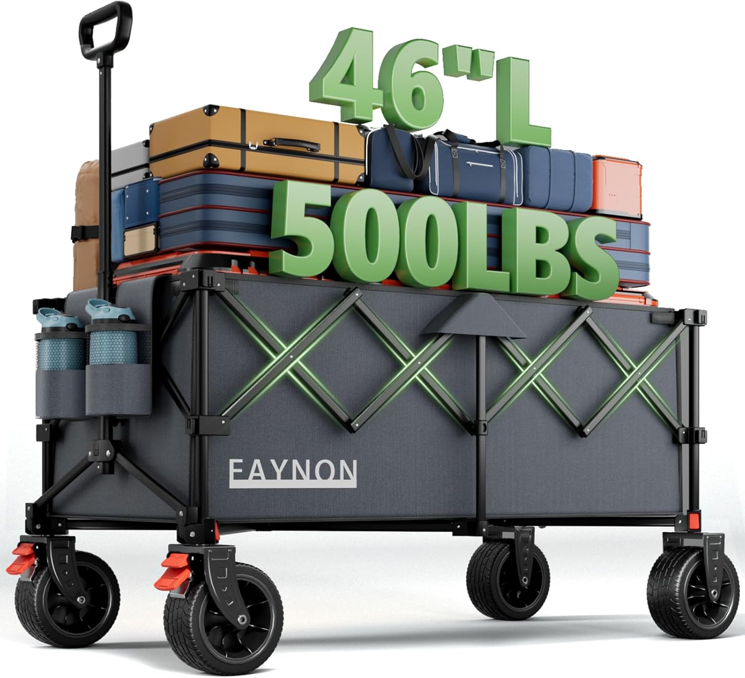 46" L Collapsible Foldable Extended Wagon, 500LB Weight Capacity with 280L Heavy Duty Folding Cart,Utility Wagon with All-Terrain Beach Wheel & Drink Holders,Gray