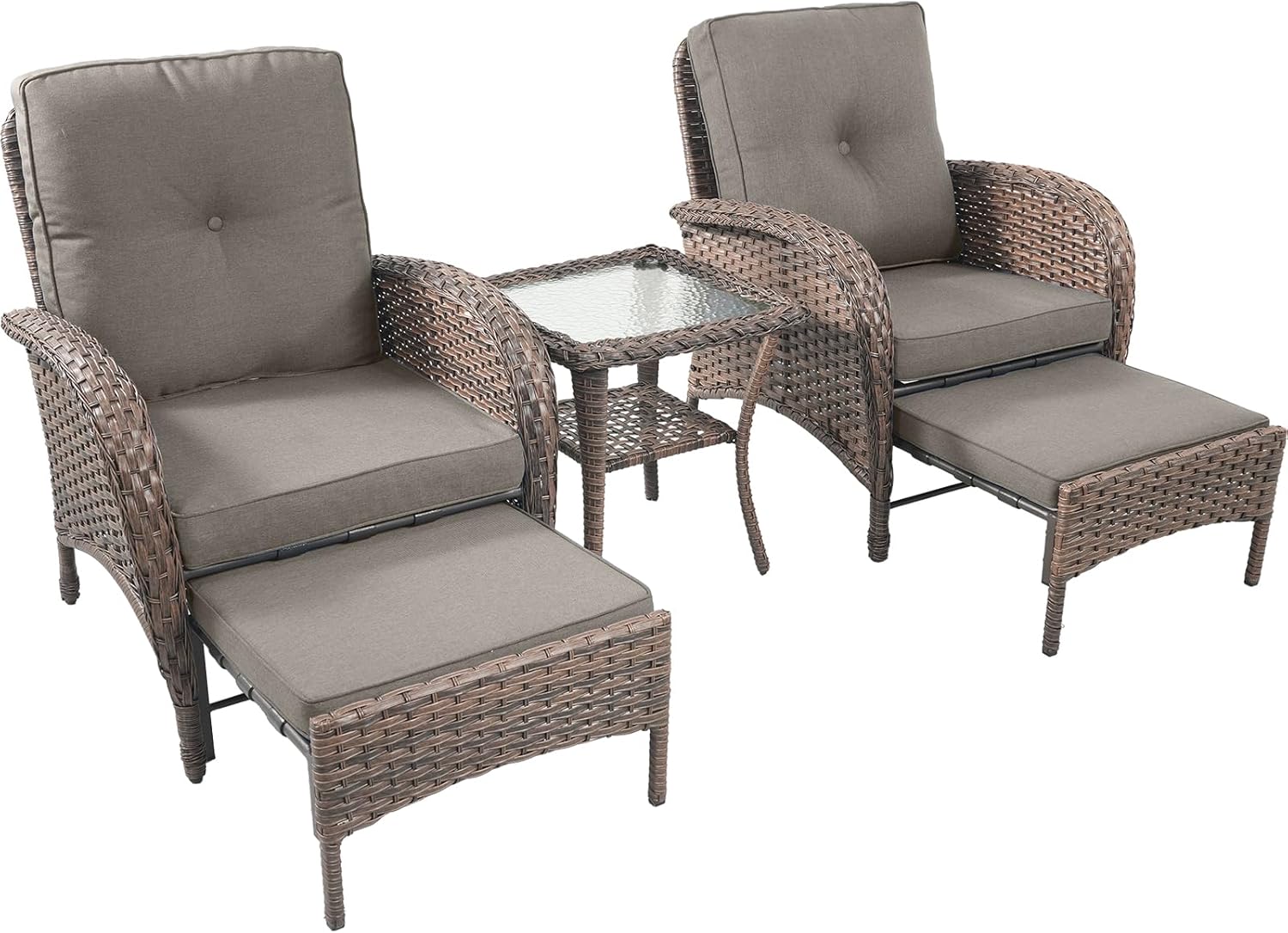 - 5-Piece Balcony Solution: Strategically combines 2 all-weather PE wicker chairs, 2 space-saving hidden ottomans, and 1 tempered glass side table. Suitable for Patio, Deck, Front porch, Garden, Yard, Backyard, Poolside, Balcony, Lawn. The wicker patio conversation sets are also an excellent choice as a gift for your family and friends.