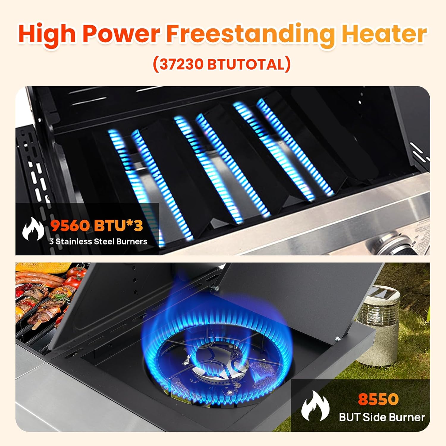 - 🔥 High-Performance Stainless Steel Burners - This propane gas grill features 3 powerful stainless steel burners and side burner delivering a total of 37,230 BTU per hour. With a built-in piezoelectric ignition system, you can enjoy instant start-up—just push and turn the control knob. It’s reliable, efficient, and ready to fire up your outdoor meals in seconds.