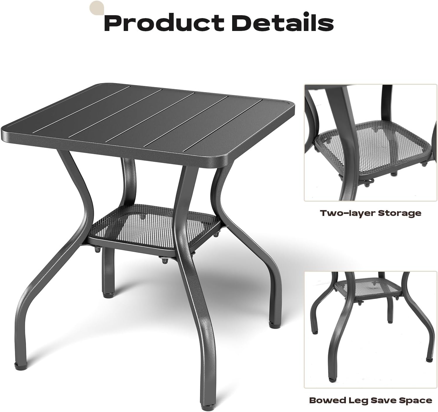 - Stylish Design - The compact metal outdoor side table fits any space. The product size is 20(W) x 20 (D) x 22(H) inches. It is designed with a grey frame paired with a grey tabletop, giving it an elegant look. Will decorate your patio and add fun to your life.