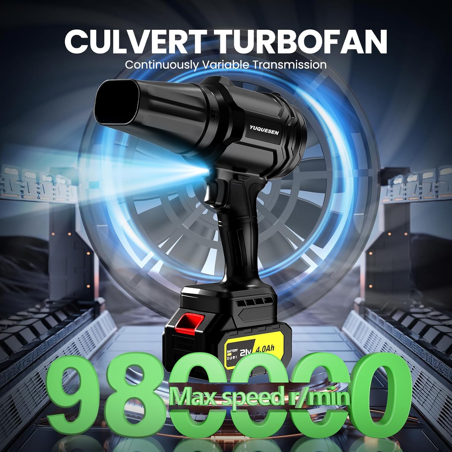 - 【980,000 RPM Turbo Power – 3X Faster Than Raking】This cordless leaf blower features a high-efficiency turbine motor that delivers hurricane-force wind speeds of 50+ m/s (equivalent to 110+ mph), blowing away wet leaves, grass clippings and debris in seconds. It features aerodynamic, technological blades that maintain optimal performance without overheating, making it perfect for large yards.