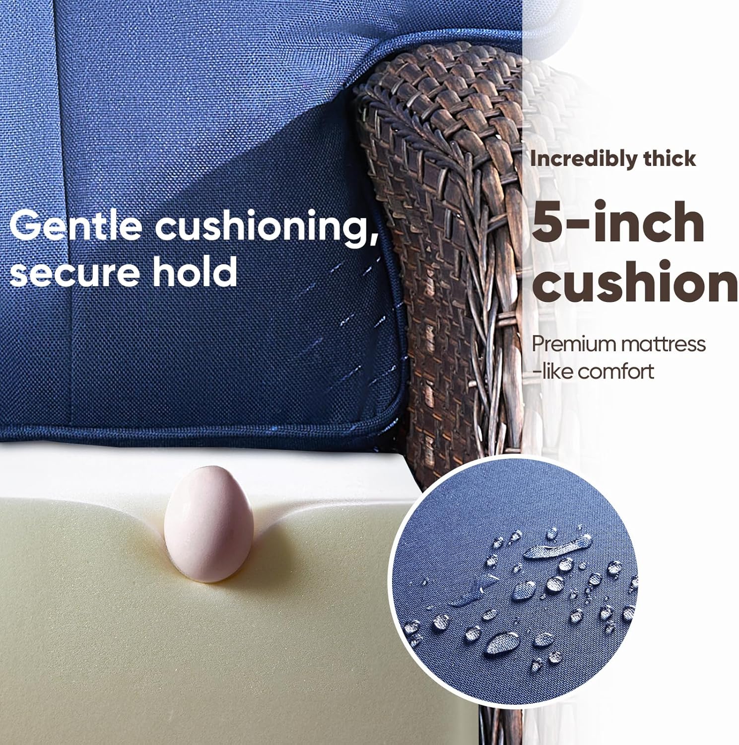 - 【Luxury T-shaped Wide Cushion】: This wicker rocking chair features a 31-inch-wide backrest. The 5-inch cushion on the outdoor rocking chair swivel chair is made of high-density 28D foam, perfectly balancing softness and support. Its quick-rebound properties ensure long-term shape retention and comfort. The backrest is filled with three-dimensional spaced cotton. The cushion cover is made of premium OLEFIN fabric, offering UV resistance, waterproofing, and fade resistance. Compared to ordinary polyester fabric, it is more comfortable and durable