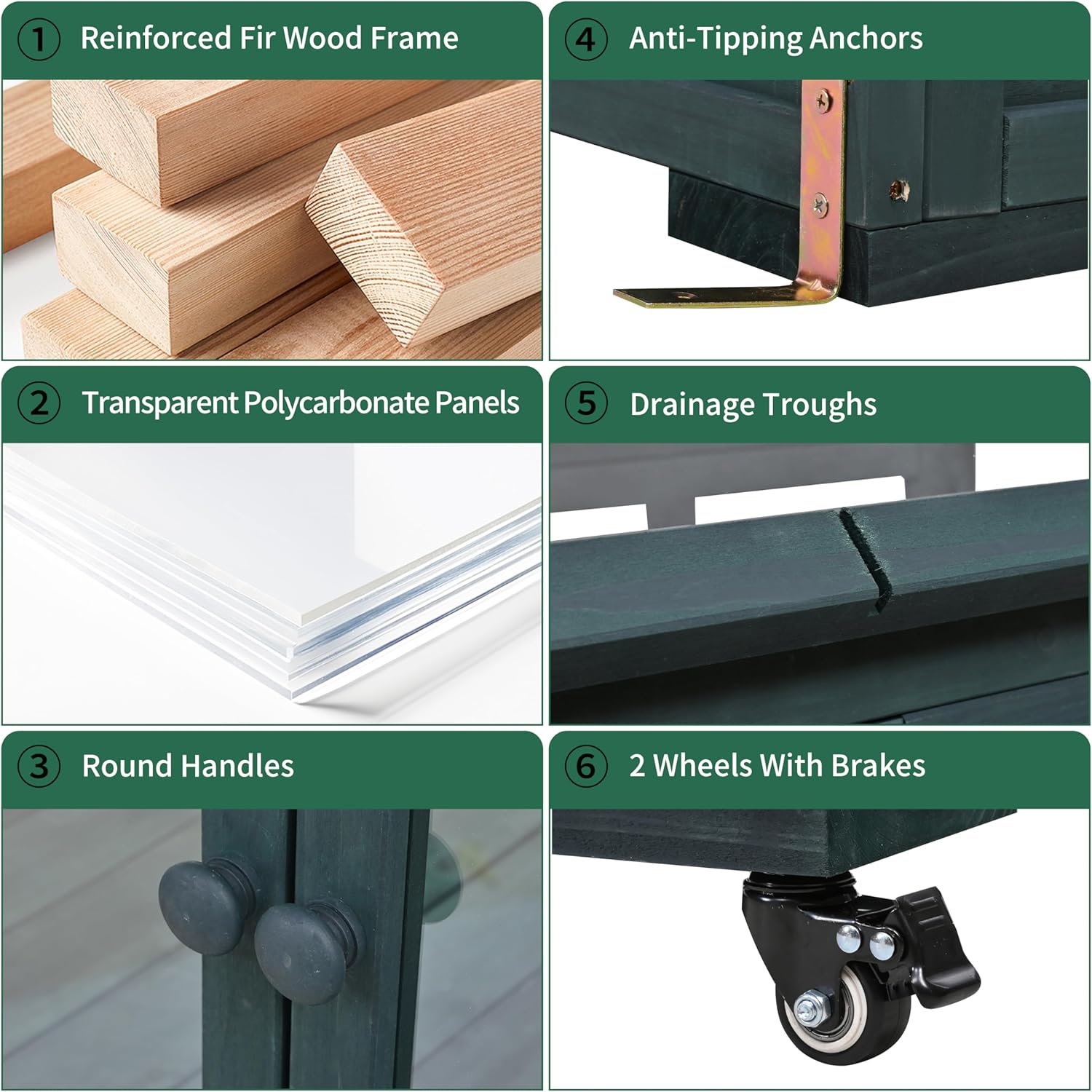 - Durable Fir Wood & Polycarbonate Panels – Built with 100% natural fir wood and UV-resistant polycarbonate panels that diffuse sunlight evenly, protecting plants from harsh rays while maintaining optimal growth conditions for seedlings, herbs, and winter crops.