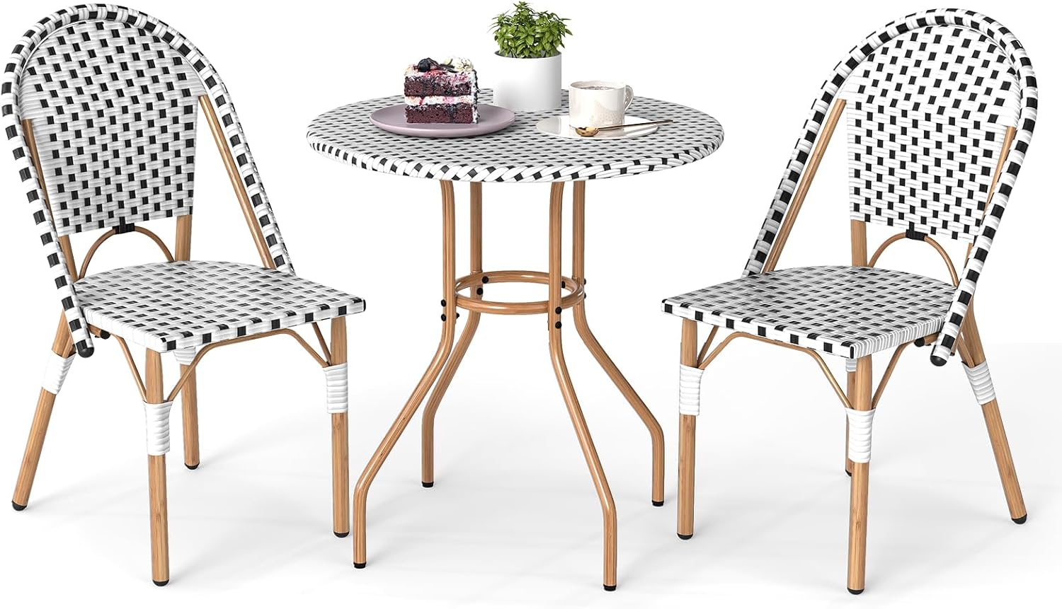 Tangkula 3 Piece French Bistro Table Chair Set, Outdoor Wicker Round Table & 2 Dining Chairs with Metal Support, Outside Accent Dining Furniture Set for Garden, Balcony, Porch