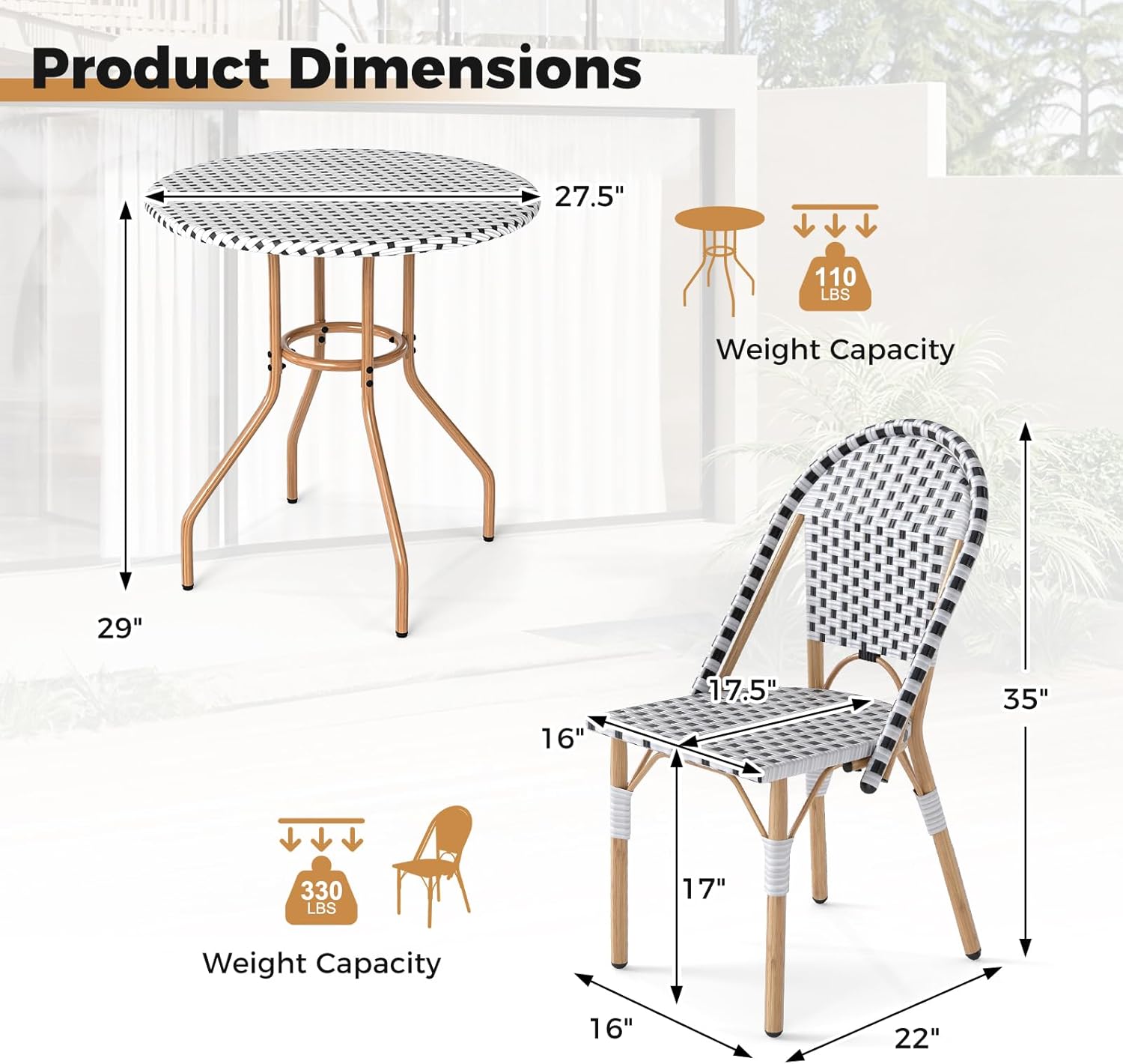 - Versatile Outdoor Ensemble: Ideal for intimate outdoor dining or relaxation, this bistro set is perfect for backyard, porch, garden or poolside. Note: Please avoid rain exposure for prolonged service life. Dimensions of table: 27.5” × 29” (Dia × H). Dimensions of chair: 22” x 16” x 35” (L x W x H).
