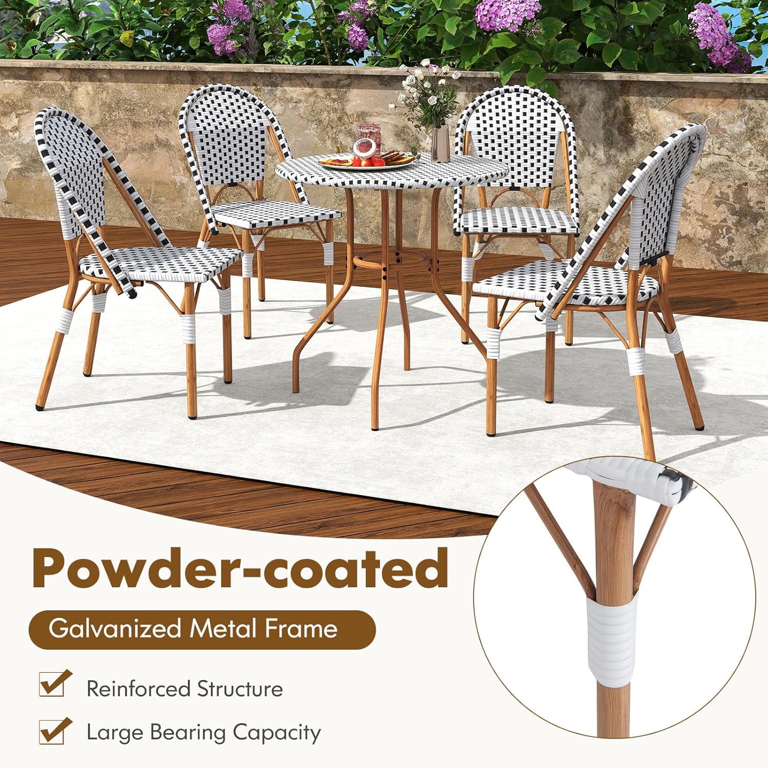- Comfort Meets Style: The bistro chairs of this outdoor set feature an ergonomic backrest that contours to your body, offering enhanced comfort and support during dining and relaxing moments.