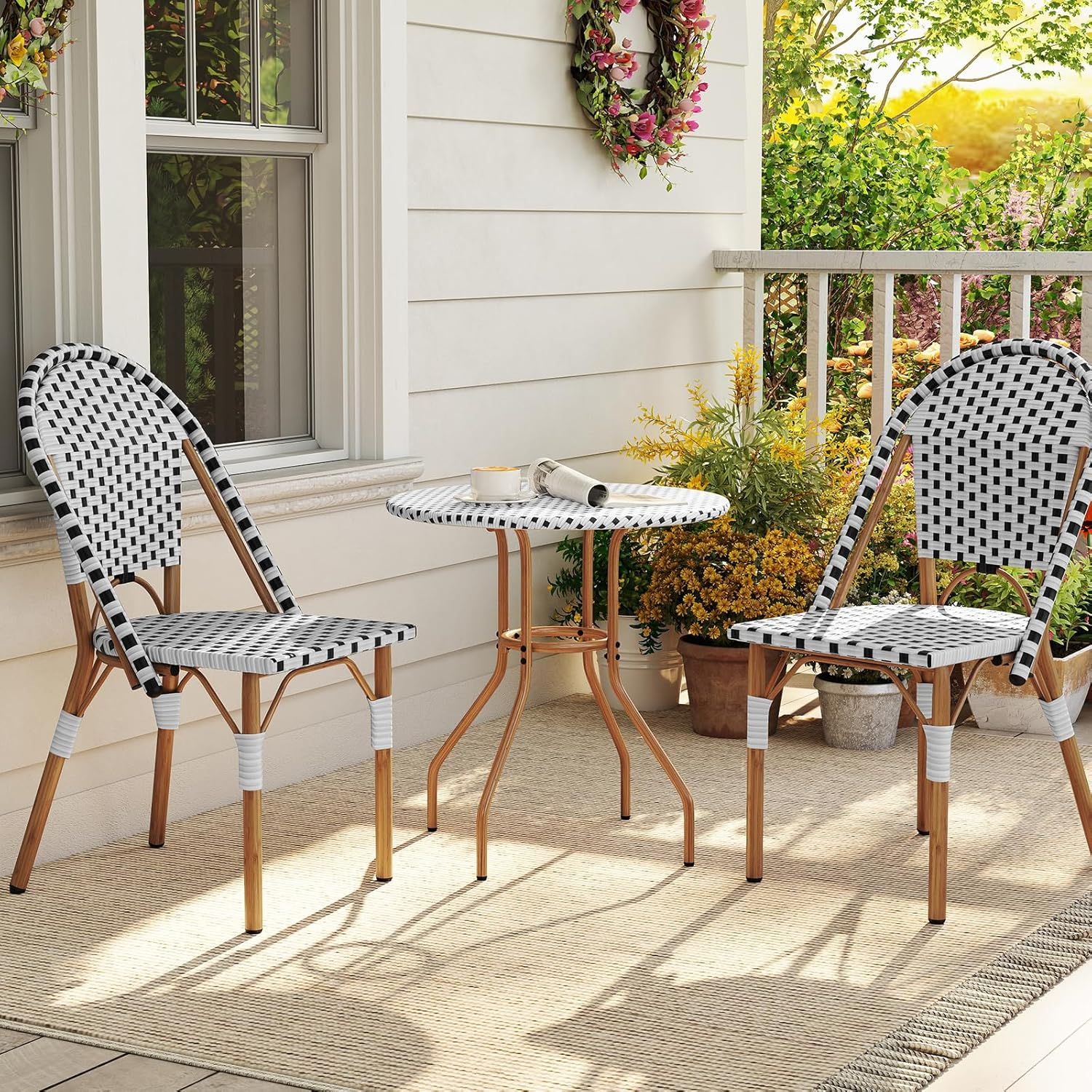 - Long-Lasting PE Rattan: Crafted from enduring and sunproof PE rattan, this patio bistro set is designed for durability and longevity. The expertly hand-woven rattan enhances outdoor decoration with its sophisticated flair.