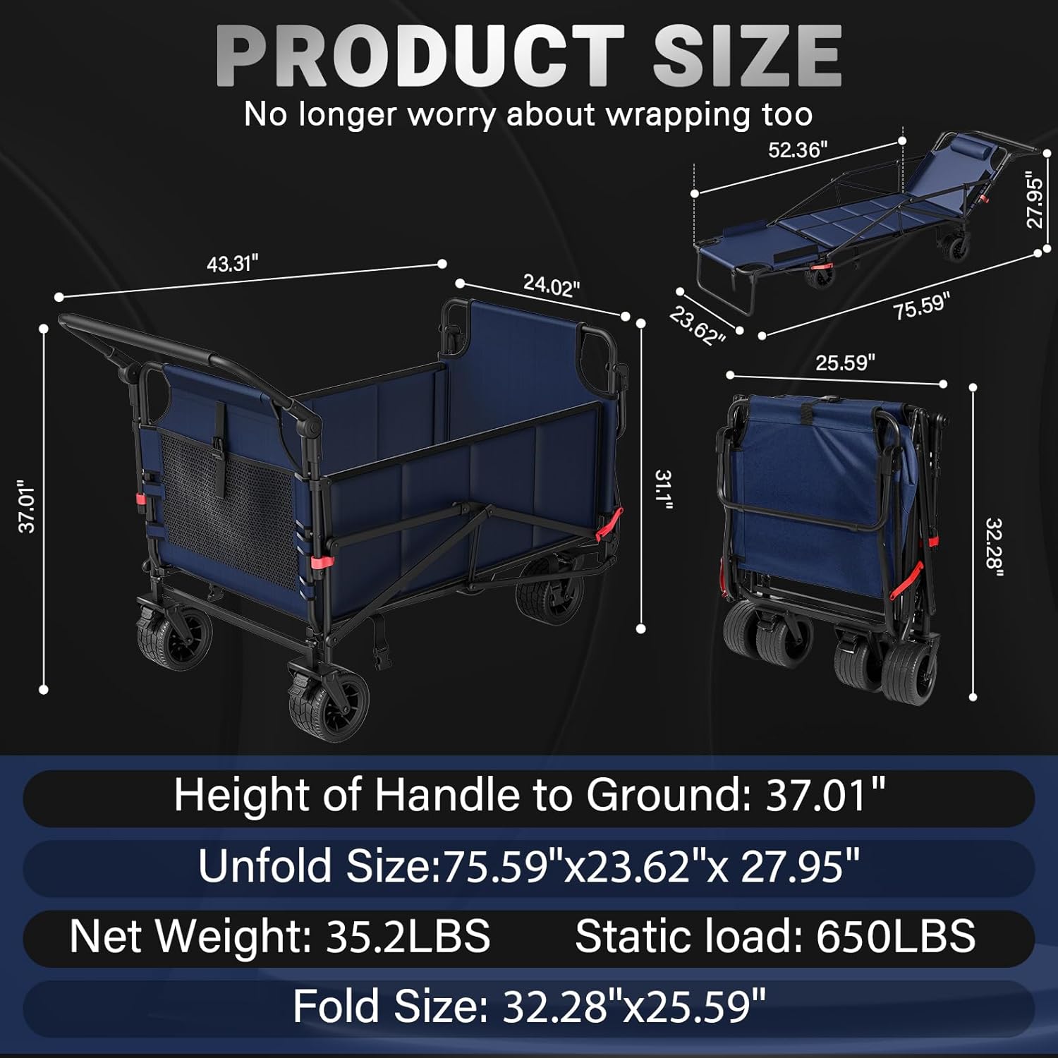 - [Product Size &Large Capacity]The 2-in-1 wagon cart takes only a minute to assemble,Extra large storage space(Cart Mode: 43.31" L x 24.02" W x 37.01" H .Chair Mode: 75.59" L x 23.62" W x 27.95" H). Included two elastic cords to meet your daily needs