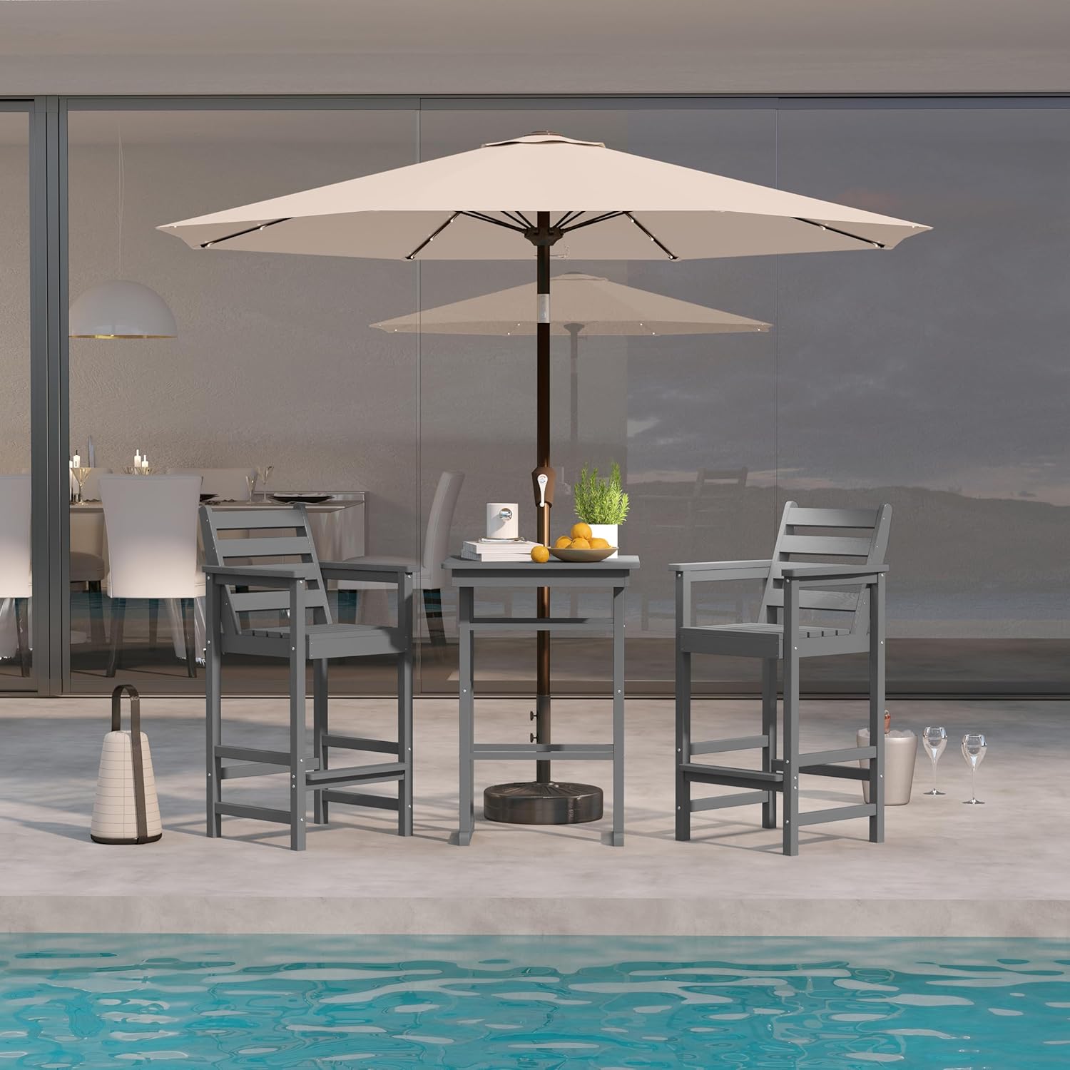 - Durable All-Weather Build: Made of HDPE with a wood-like texture, this outdoor bar set includes a 9FT beige patio umbrella with solar lights and base. It resists sun, rain, wind, and snow without fading or cracking. Great for decks, patios, and backyards, it’s built for year-round outdoor use. (Ships in 3 separate boxes that may arrive on different days.)
