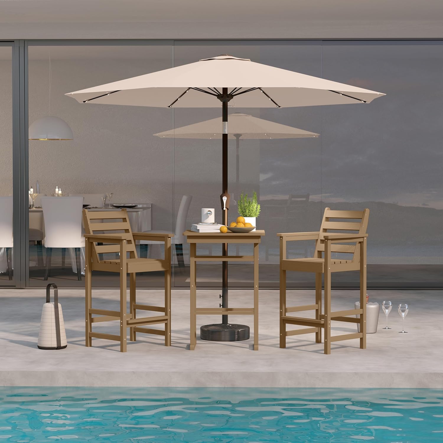 - Durable All-Weather Build: Made of HDPE with a wood-like texture, this outdoor bar set includes a 9FT beige patio umbrella with solar lights and base. It resists sun, rain, wind, and snow without fading or cracking. Great for decks, patios, and backyards, it’s built for year-round outdoor use. (Ships in 3 separate boxes that may arrive on different days.)