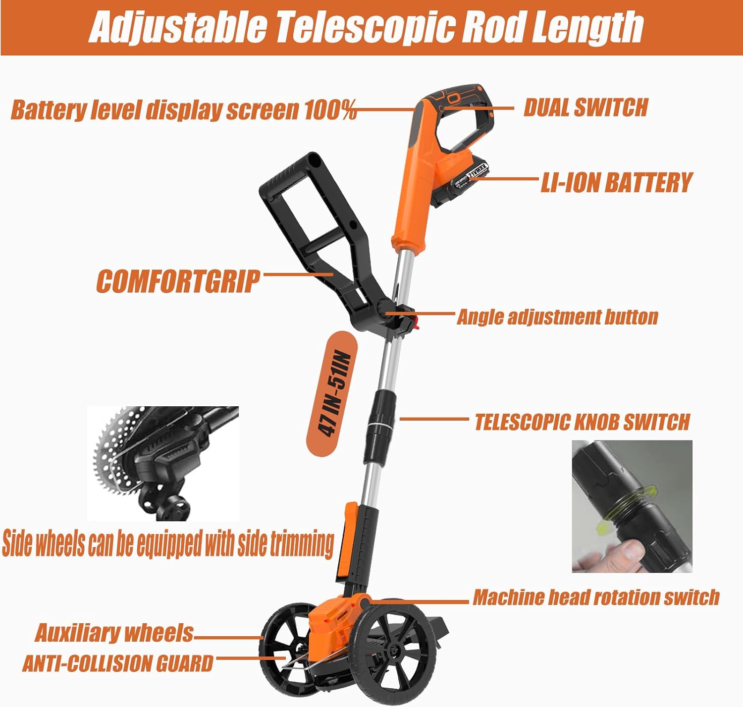 - ADJUSTABLE HEIGHT & ROTATING HEAD: The handle adopts ergonomic design Adjustable length of telescopic shaft which total length is about 41- 57inch, weight is only 4.5 pounds, The angle of the String Trimmer Cordless head can be adjusted (0-90°) at will to fit for most complex working environments. women and the elderly can easily use. allowing you to easily care for any hard-to-reach nooks and crannies
