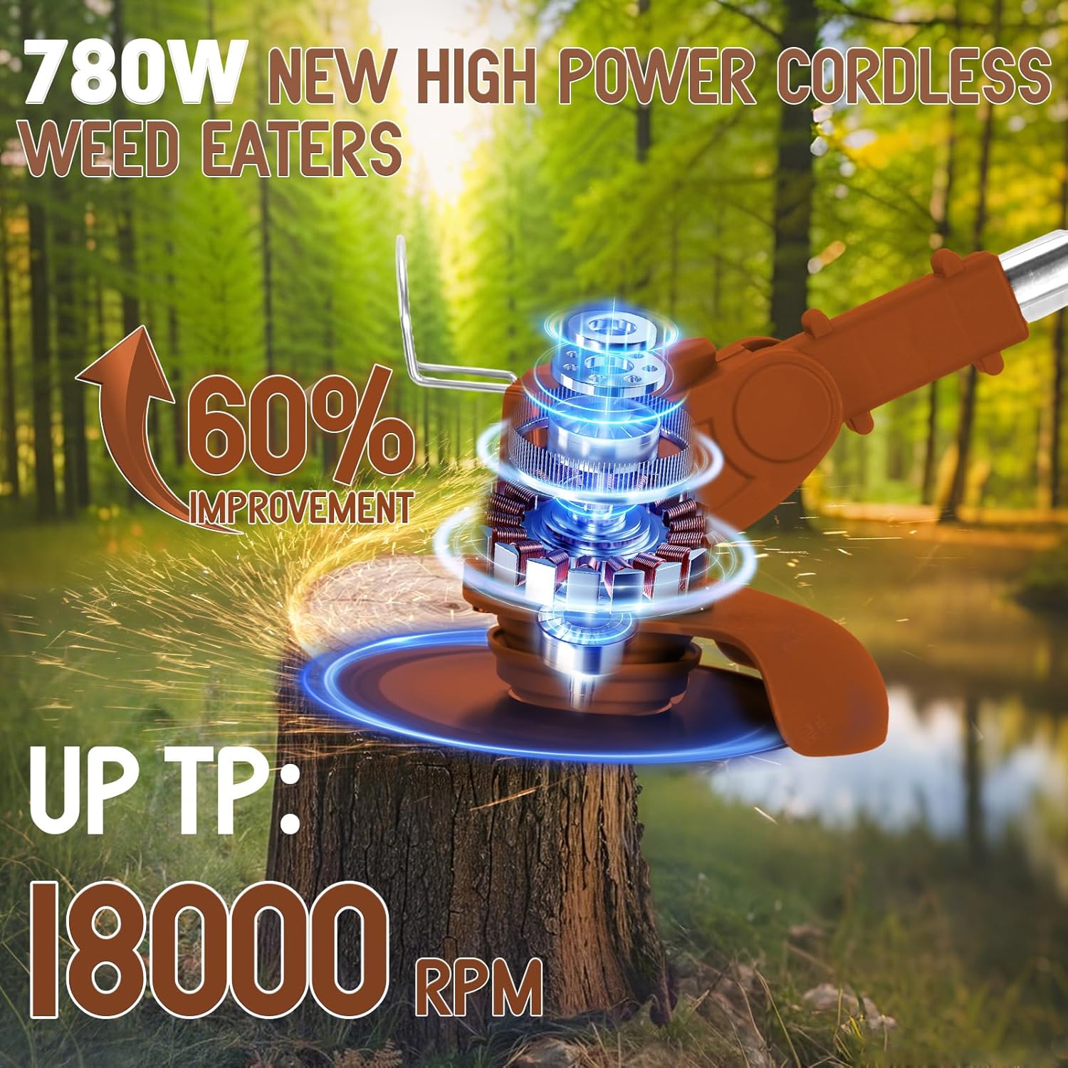 - [Powerful Performance]With an 18,000 RPM motor and 305mm cutting width, this electric weed wacker cordless slices through thick grass and weeds like a pro. Outperforms gas trimmers—quiet, eco-friendly, and zero maintenance!