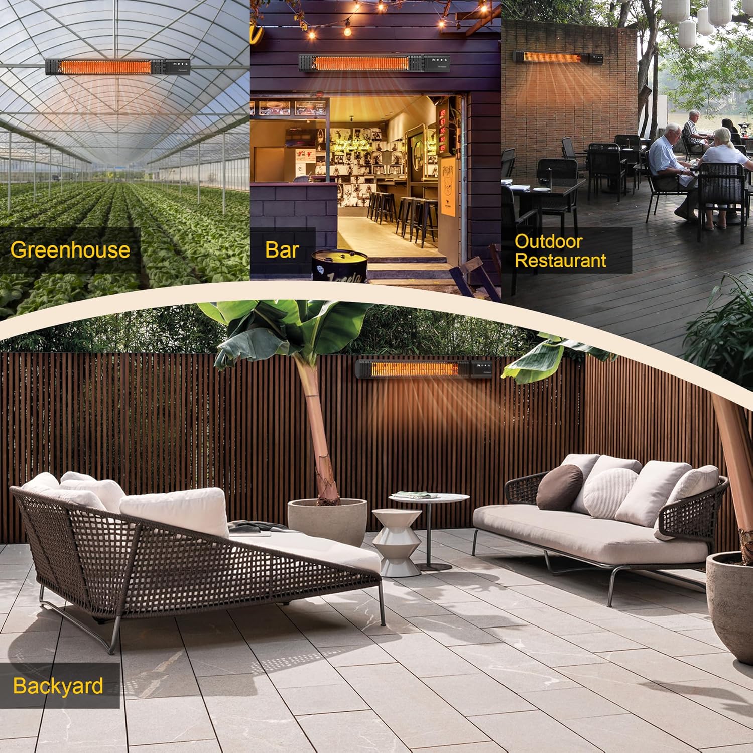 - Flexible Mounting Anywhere – Wall or ceiling installation for patios, gazebos, balconies, BBQ decks, or garages. Ideal as outdoor electric heater, outside heater for your patio, or shop heater for garage, blending into both home and commercial spaces