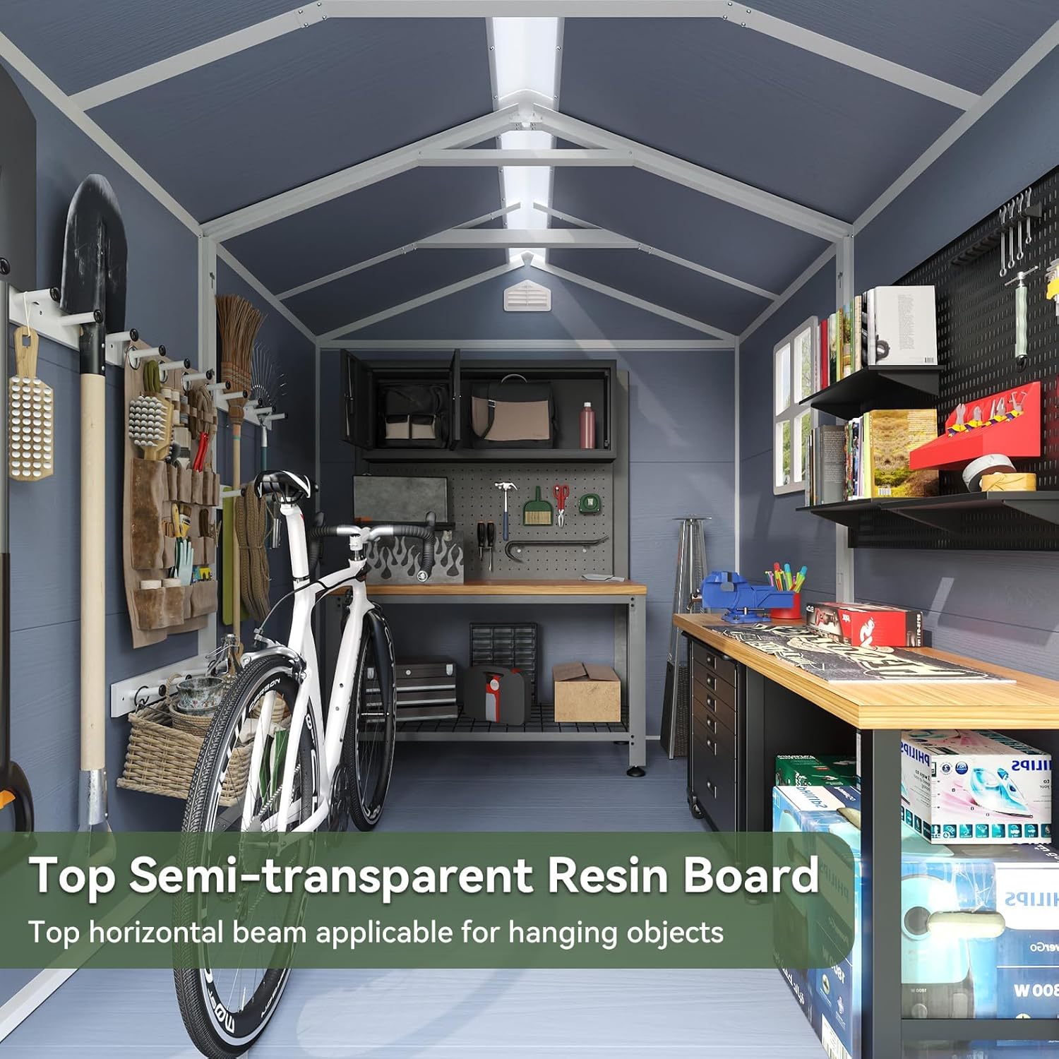 - Multi-Purpose Space: This tool house can not only perform DIY in the interior space to place items, it can also be used as a bin storage, pet housing. It also has excellent waterproof performance, which allows it to be stored in various outdoor environments