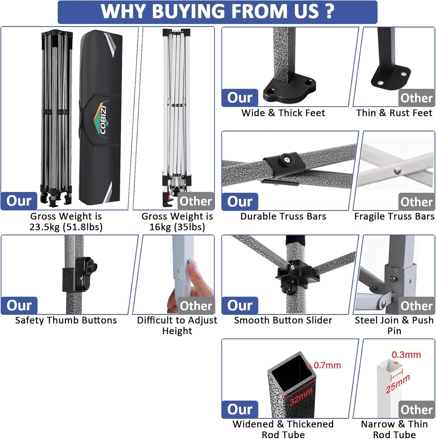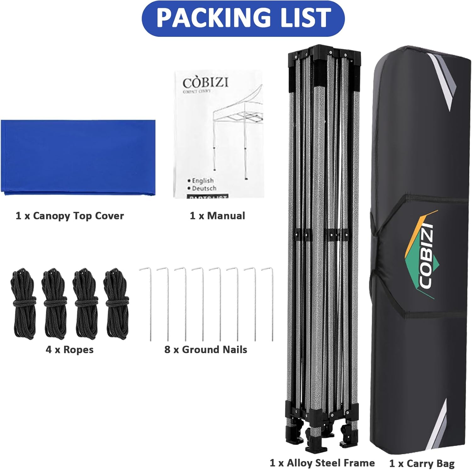 - 【100 SQ Feet Shade Area】COBIZI 10x10 pop up tent provides 100 SQFT spacious covered space, it can easily accommodate 7-10 people, meet your different needs for holding large gatherings. Perfect for wedding, birthday party, market event and other larger events. When in use, always secure the 10x10 pop up tent with the included stakes and ropes to avoid damage. One year after-sale protection for canopy frame; Six months after-sale protection for fabrics and accessories.