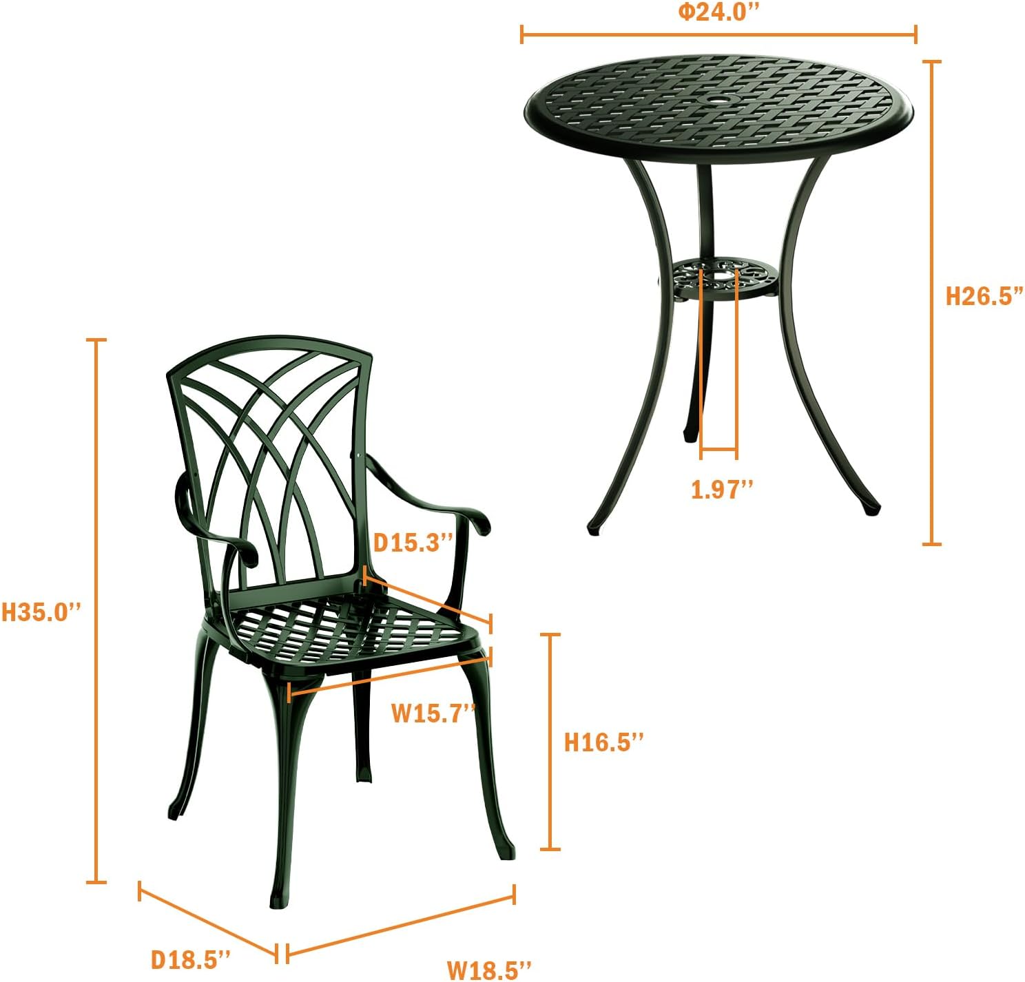 - 【Durable Cast Aluminum】Made of anti-rust, weather-resistant cast aluminum, making bistro set perfect for long-term outdoor use in any climate