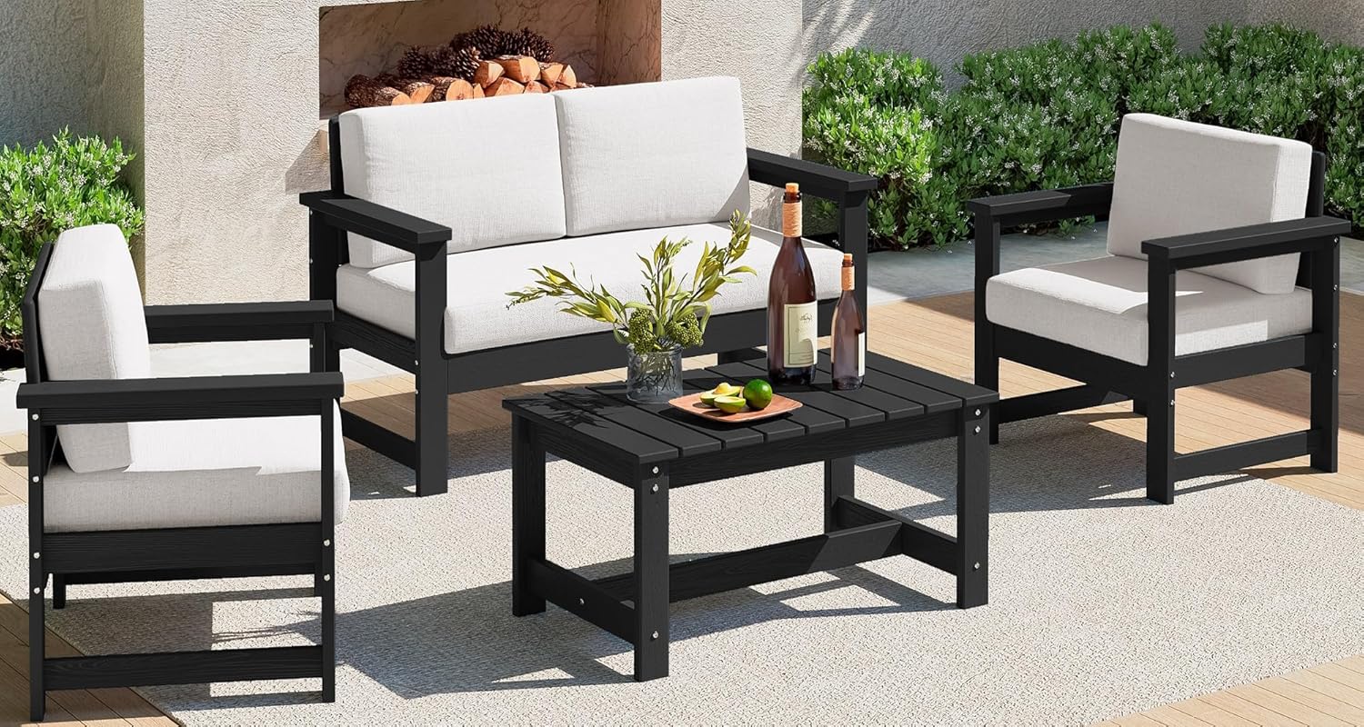 SERWALL 4-Piece Outdoor Patio Sofa Set, HDPE All-Weather Loveseat Sofa with Cushions & Coffee Table, Black Frame & Khaki Cushions