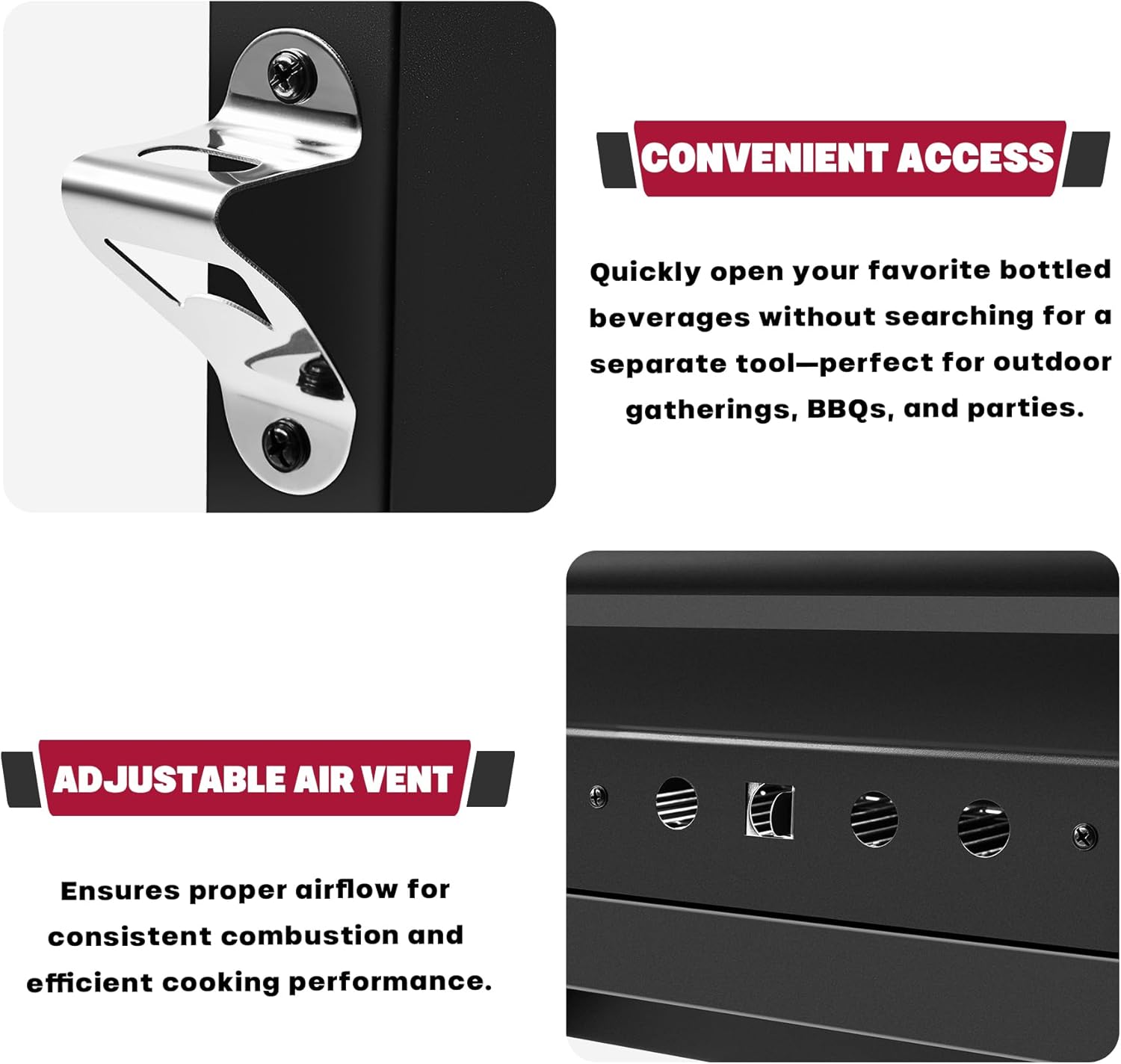 - Integrated Bottle Opener and Ventilation System: The built-in bottle opener adds a touch of convenience for parties and gatherings, while the top-mounted chimney and back vents ensure proper airflow, helping you maintain consistent heat and reducing flare-ups during longer grilling sessions.
