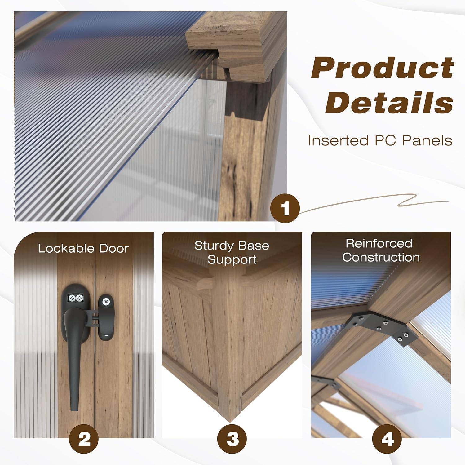 - 【Lockable Door& Walk-in Space】: This walk-in greenhouse features a front door you can easily access and lock it after leave. Decorate your backyard by adding this wooden greenhouse and other furniture to create a warm, inviting space.