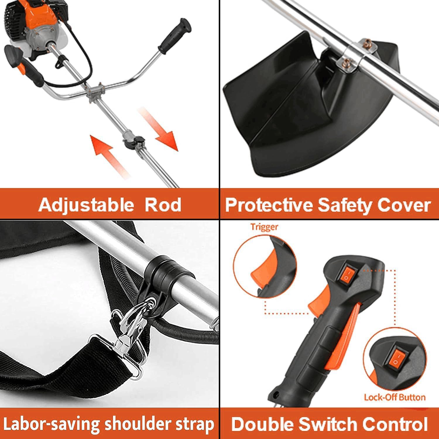 - 【Ergonomic Designs】The weed wacker gas powered adjustable U-handle and equipped with straps to reduce product weight. No need to bend over, trim more efficiently and effectively with full comfort and command. Durable metal blade allows you to cut through dense vegetation and grass in less time. Efficient work without fatigue.