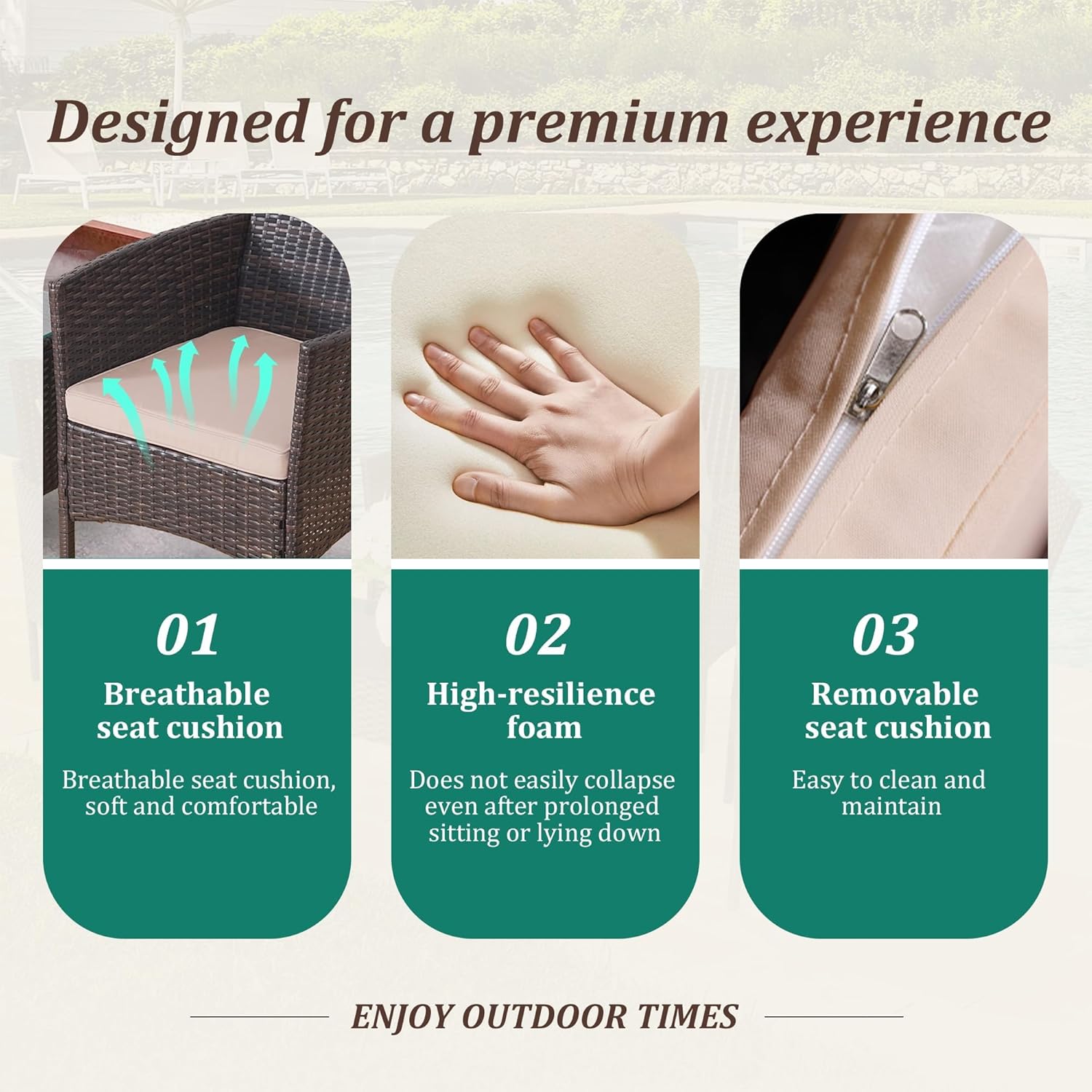 - 【Complete 3-Piece Set】 Includes 5 main furniture (1 Coffee Table + 2 Chairs + 2 Seat Cushions). Everything needed for instant outdoor living