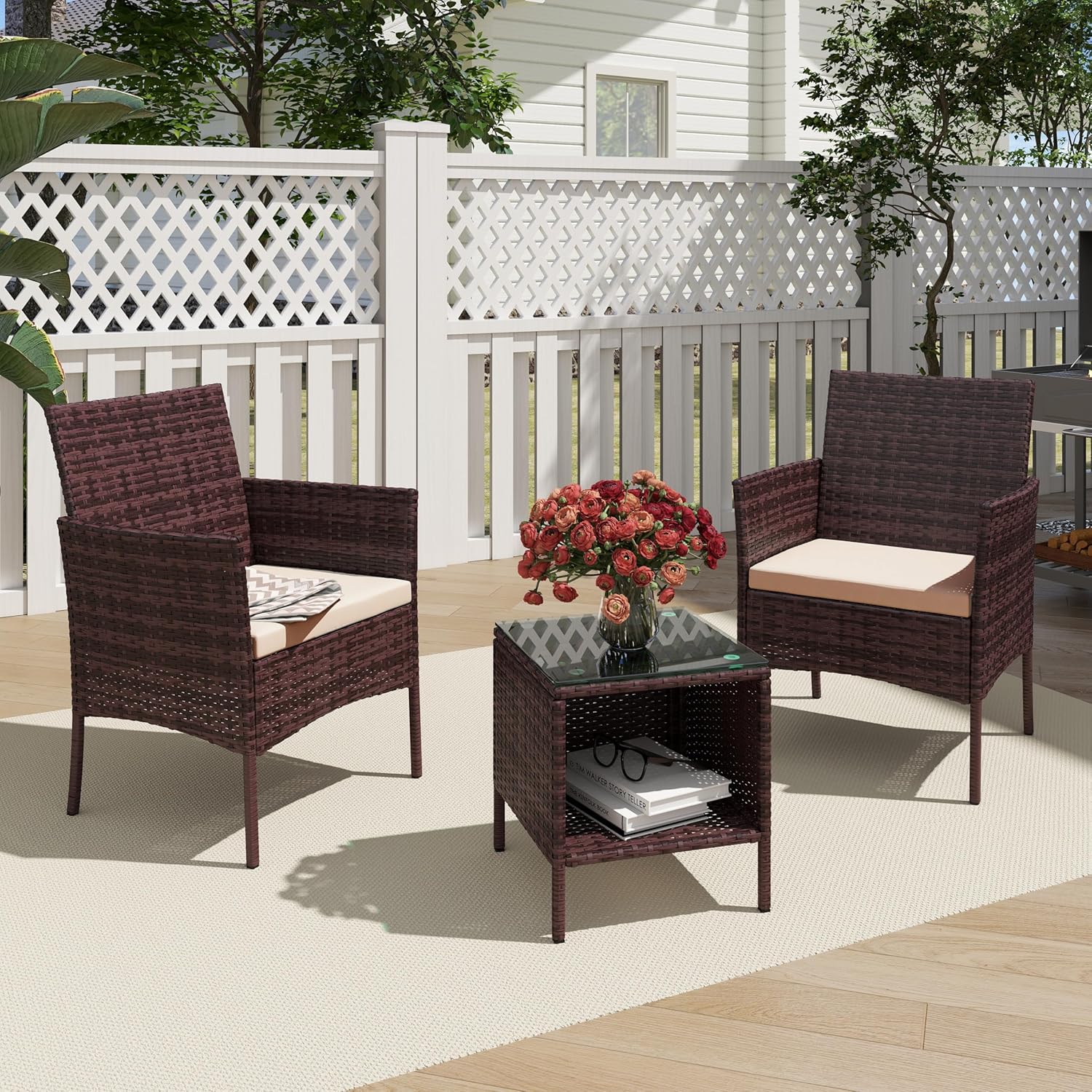 3 Piece Patio Furniture Set - Outdoor Conversation Sets with Coffee Table, Rattan Chair Set for Garden/Poolside, Brown/Grey