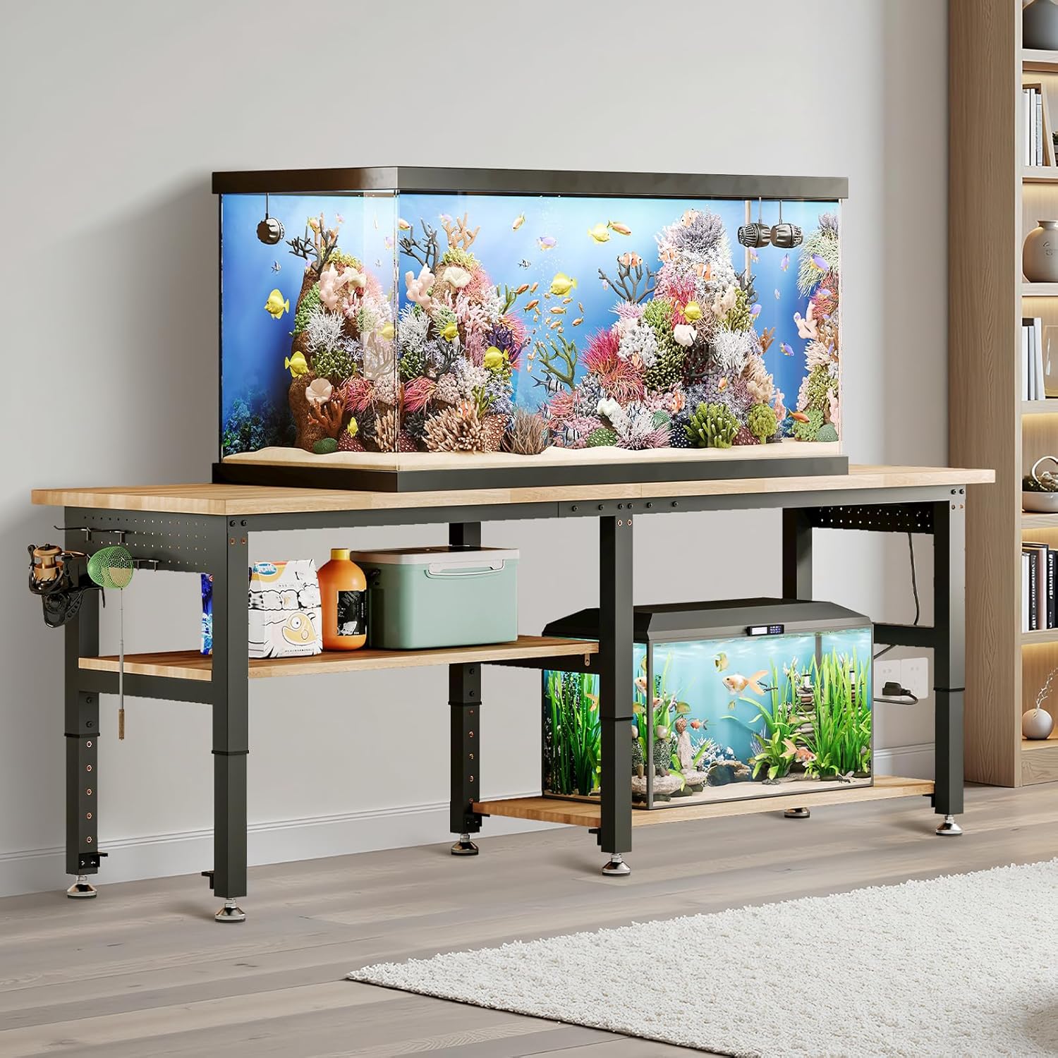 - 【2-Tier Adjustable Storage Design】Two spacious tiers plus built-in pegboards and 20 hooks provide flexible, organized storage for power tools, toolboxes, and supplies. DIY-friendly for woodworking or assembly.