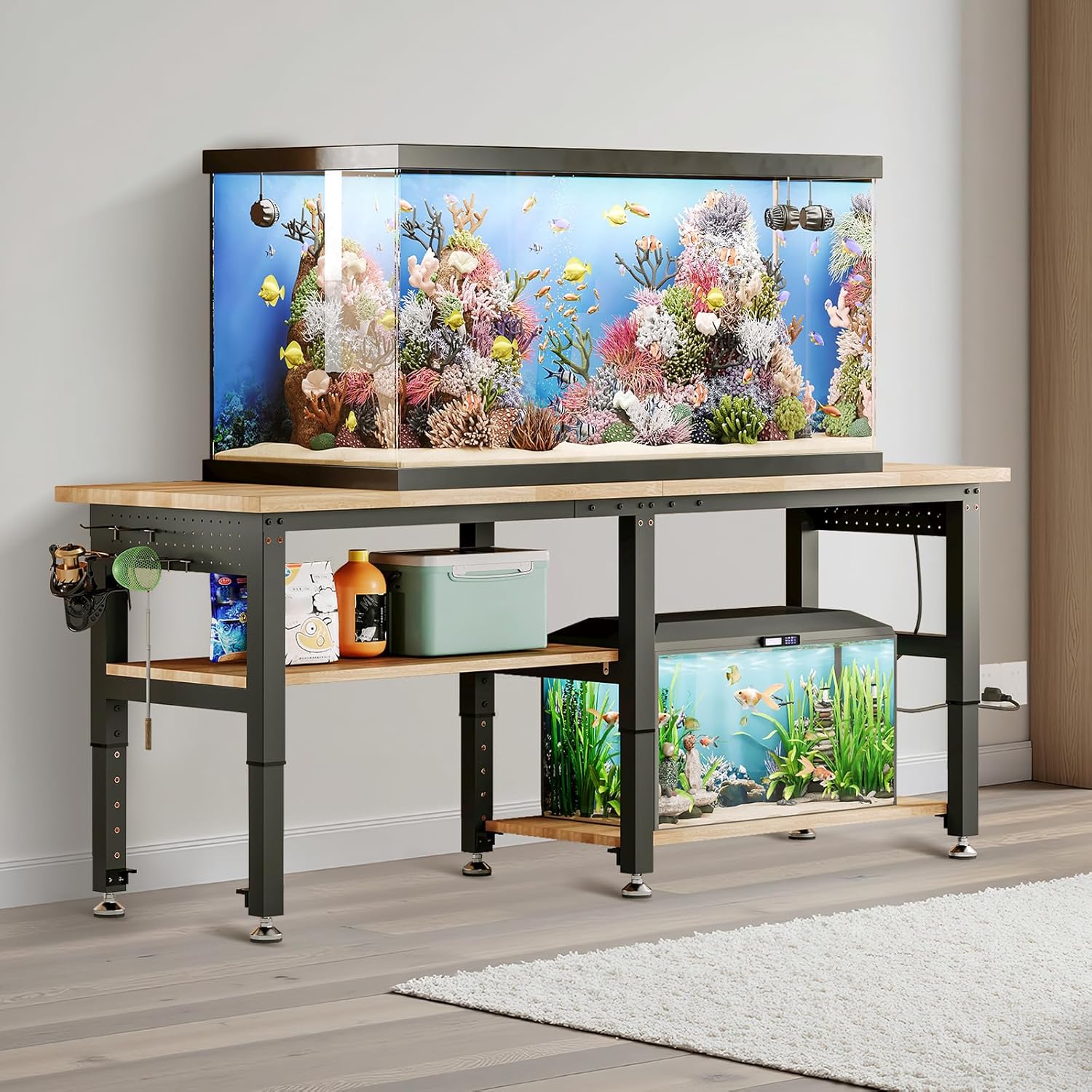 - 【2-Tier Adjustable Storage Design】Two spacious tiers plus built-in pegboards and 20 hooks provide flexible, organized storage for power tools, toolboxes, and supplies. DIY-friendly for woodworking or assembly.