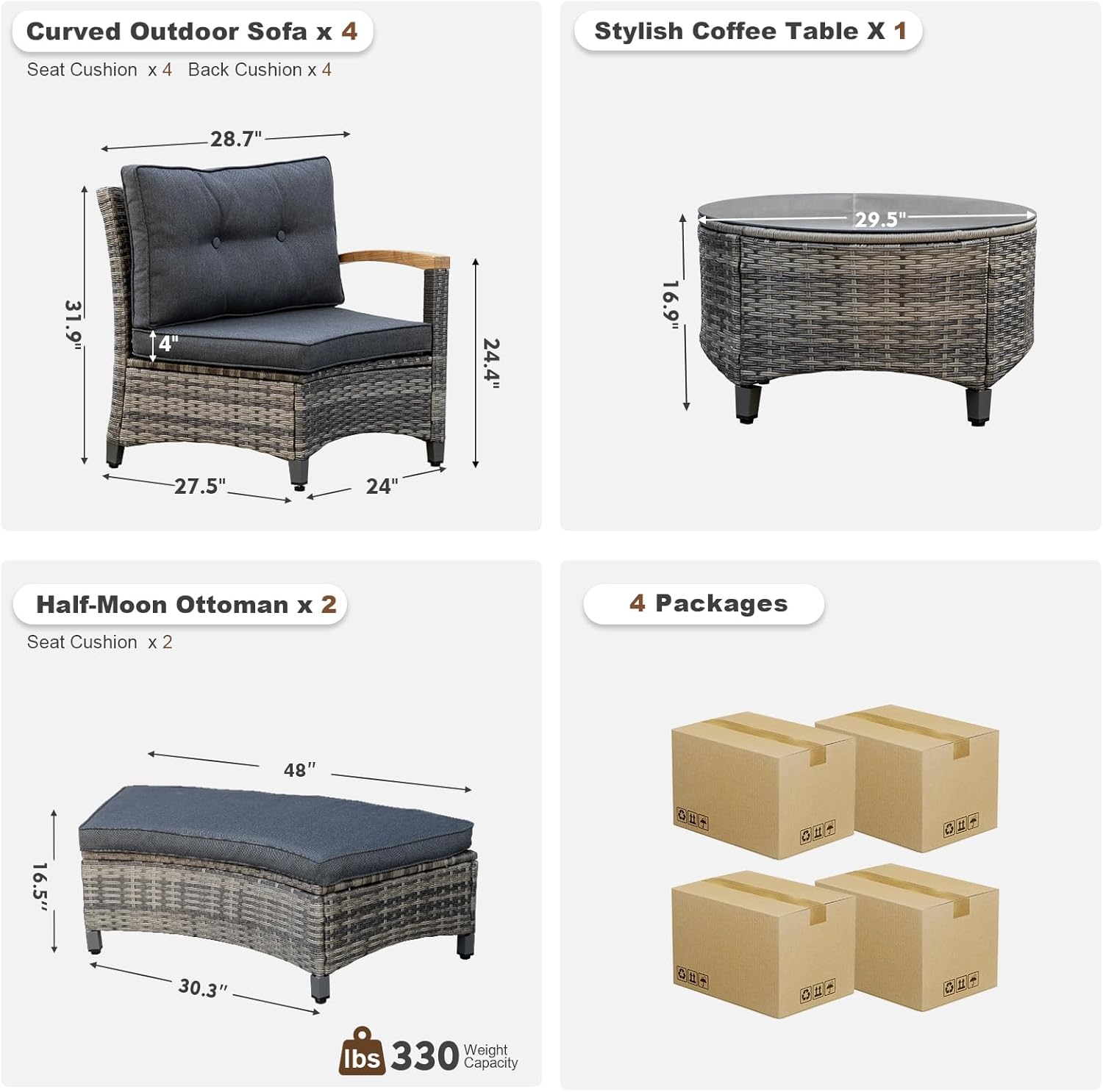 - Unique Half-Moon Design: This half-moon patio furniture set features a stylish semi-circular lounge with four curved sofas and two Half-Moon Ottomans, perfect for outdoor gatherings on your balcony, patio, or poolside