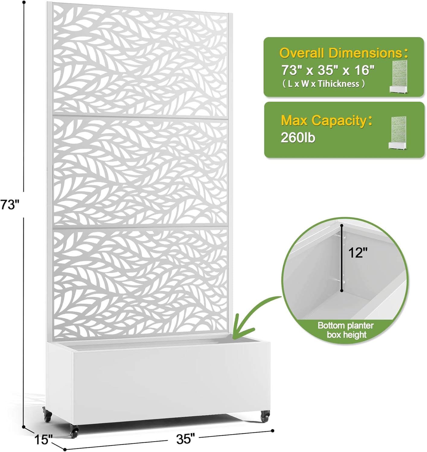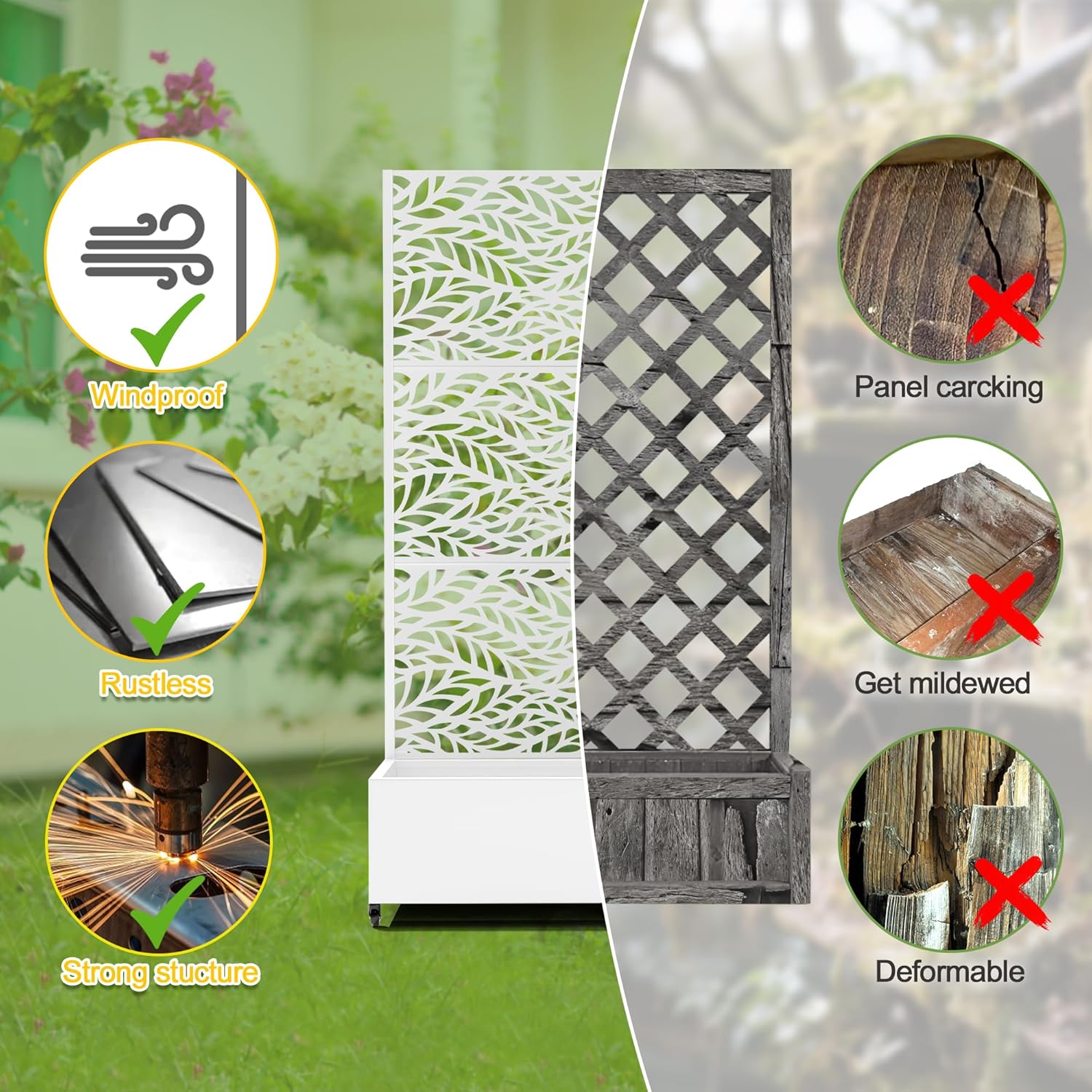 FENCY Metal Raised Garden Bed with Wheels and Trellis,73"x35"x16" Planter Box for Climbing Plants, Vegetables & Vines, Features Privacy Screen and Drainage Holes (White-Leaf)
