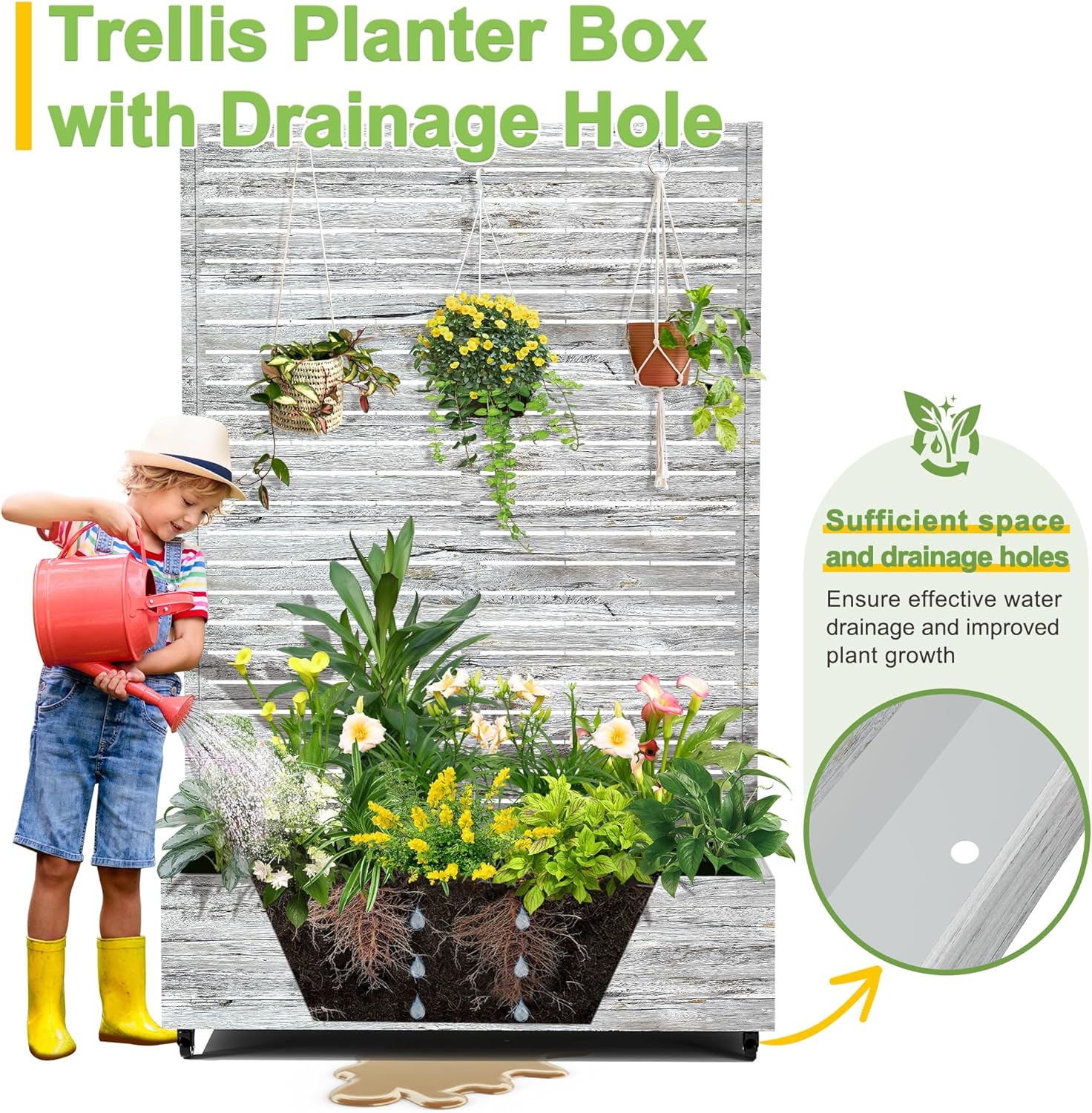 - 【Planter Box with Drainage Hole】Designed with a 12” deep planting bed and equipped with drainage holes at the bottom, this planter box provides ample space for healthy plant growth, ensuring excess water can escape and preventing waterlogging.