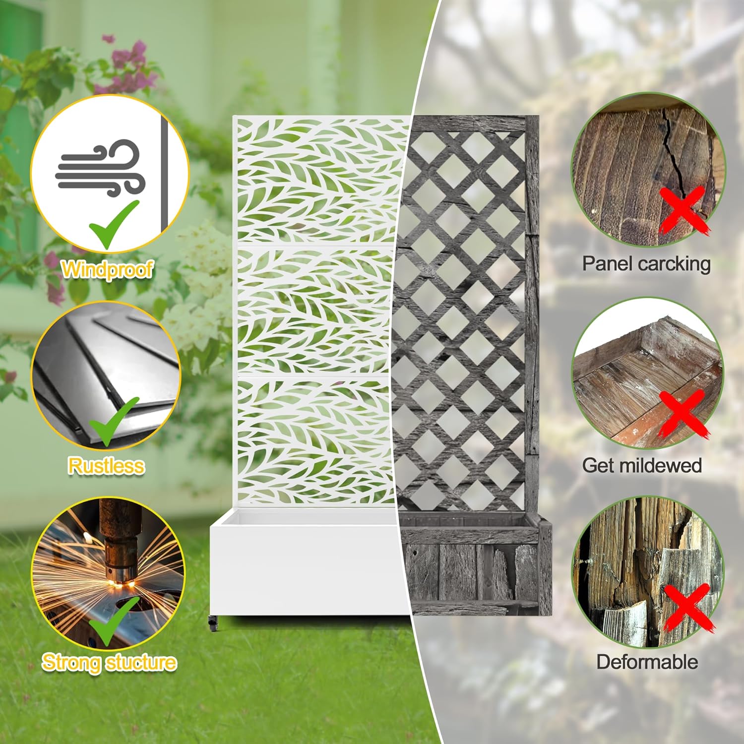 FENCY Metal Raised Garden Bed with Wheels and Trellis,73"x47"x16" Planter Box for Climbing Plants, Vegetables & Vines, Features Privacy Screen and Drainage Holes (White-Leaf)