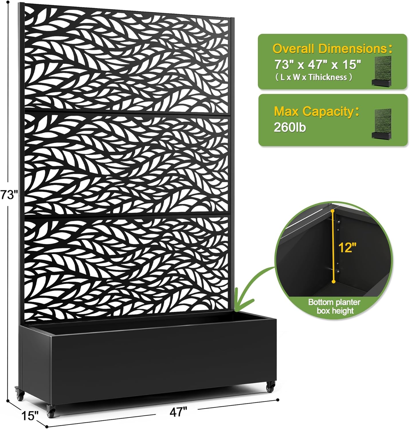 FENCY Metal Raised Garden Bed with Wheels and Trellis,73"x47"x16" Planter Box for Climbing Plants, Vegetables & Vines, Features Privacy Screen and Drainage Holes (Black-Leaf)