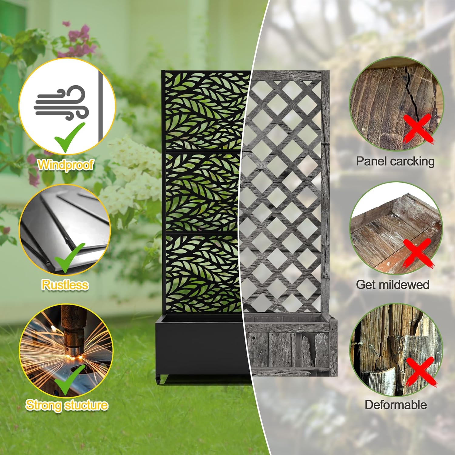 FENCY Metal Raised Garden Bed with Wheels and Trellis,73"x35"x16" Planter Box for Climbing Plants, Vegetables & Vines, Features Privacy Screen and Drainage Holes (Black-Leaf)
