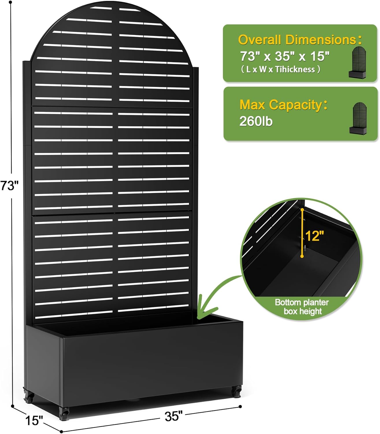 FENCY Metal Raised Garden Bed with Wheels and Trellis,Arched 73"x35"x16" Planter Box for Climbing Plants, Vegetables & Vines, Features Privacy Screen and Drainage Holes (Black-Louvered)