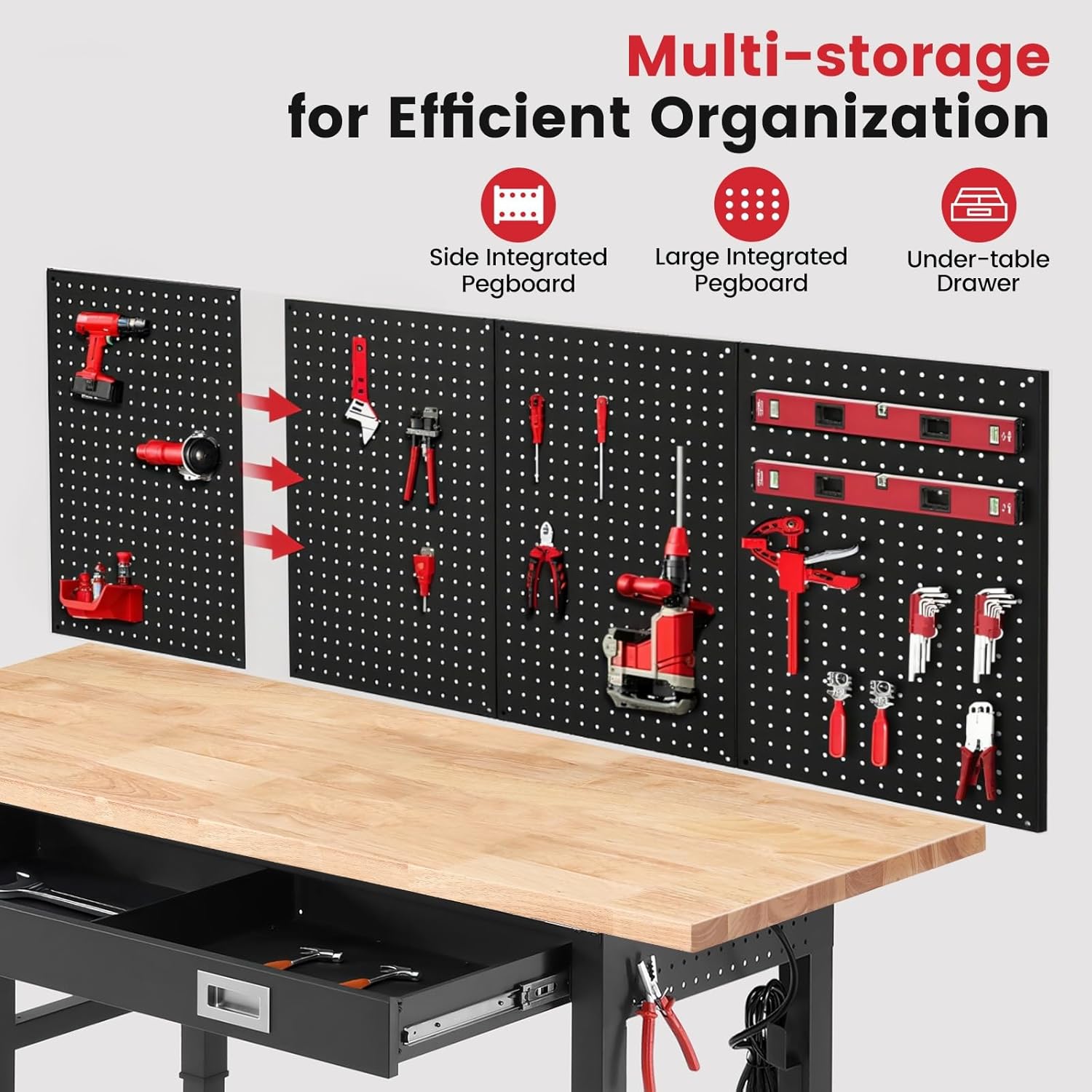 Workbench for Garage 60 x 22 Inch Adjustable Height Work Table with Drawers Heavy Duty Rubberwood Tabletop Work Bench with Pegboard, Power Outlets for Office Home Commercial