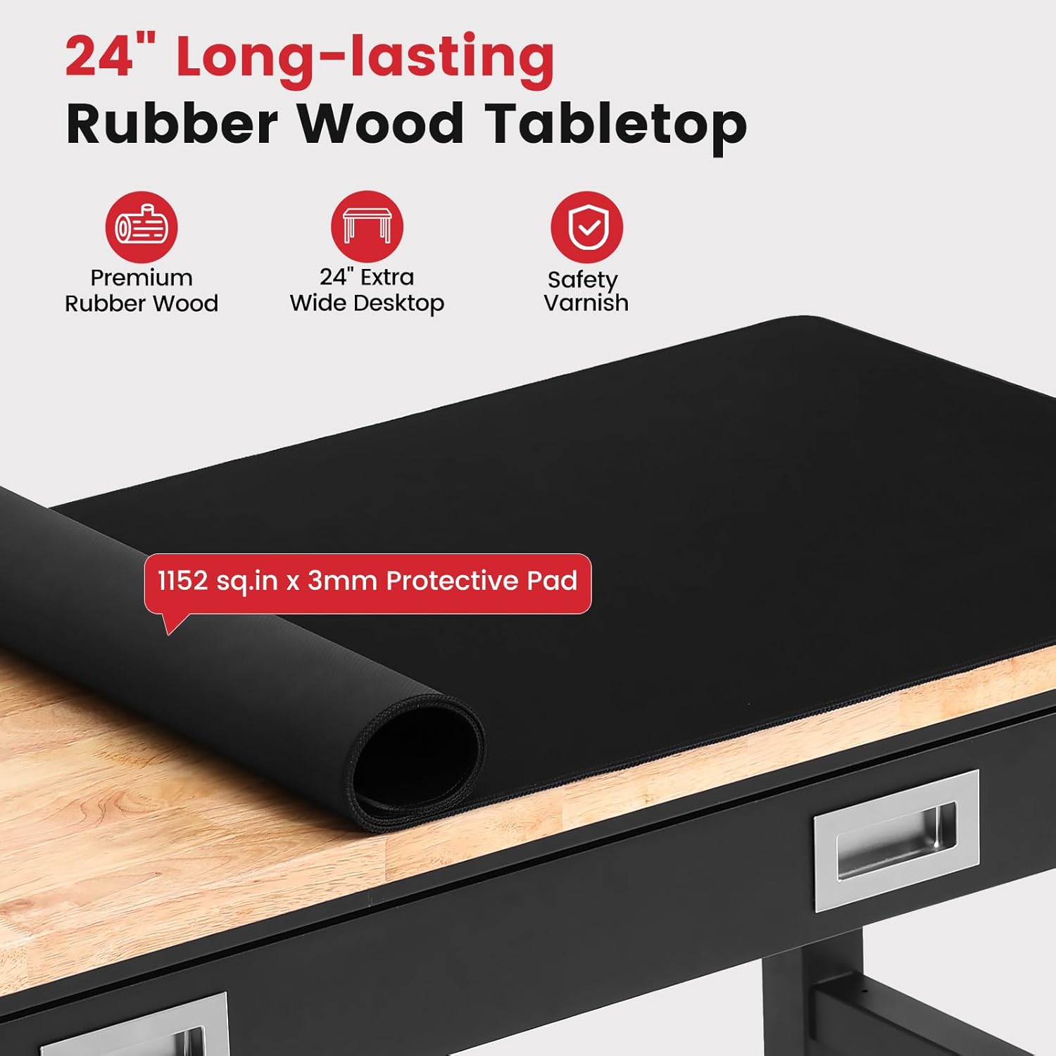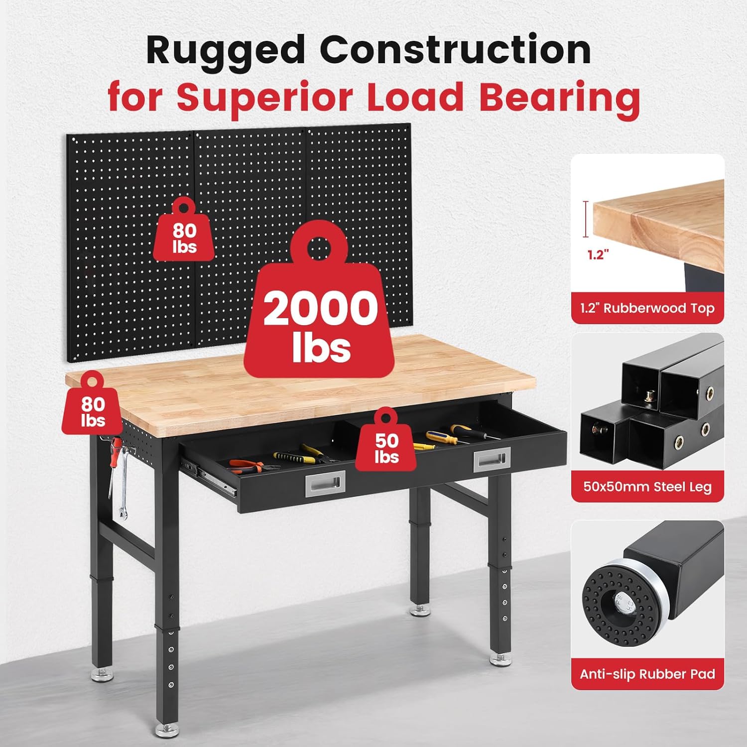 - Heavy Duty Rubberwood Tabletop: 1.2" solid rubberwood tabletop with protective varnish for lasting durability. Supports up to 2000 lbs, perfect for heavy-duty tools and materials.