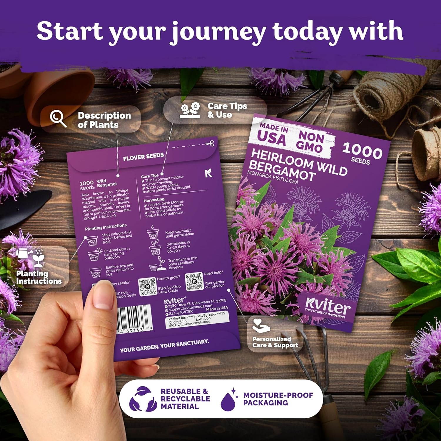 KVITER 1,000 Wild Bergamot Seeds for Planting (Monarda fistulosa) – Bee Balm Native Wildflower, Pollinator Magnet, Organic & Non GMO – Perennial Flower Seeds to Plant Outside in Flower/Herb Garden