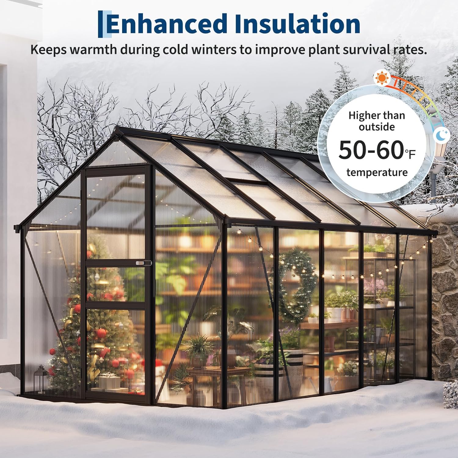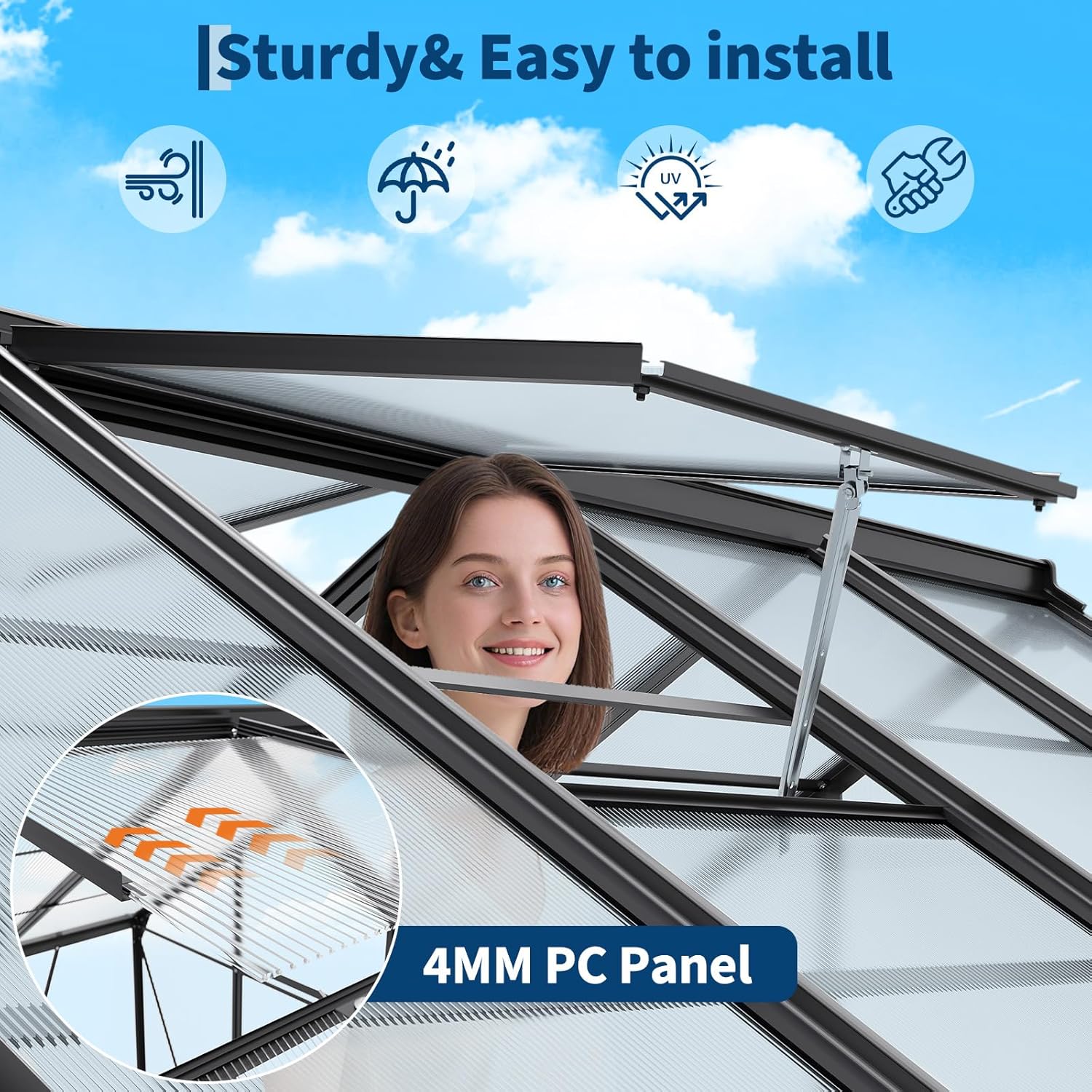 6x10FT Polycarbonate Greenhouse - Walk-in Outdoor Aluminum Frame Greenhouse with Roof Vent, Lockable Push Door for Garden, Backyard, Patio & Lawn(Black)