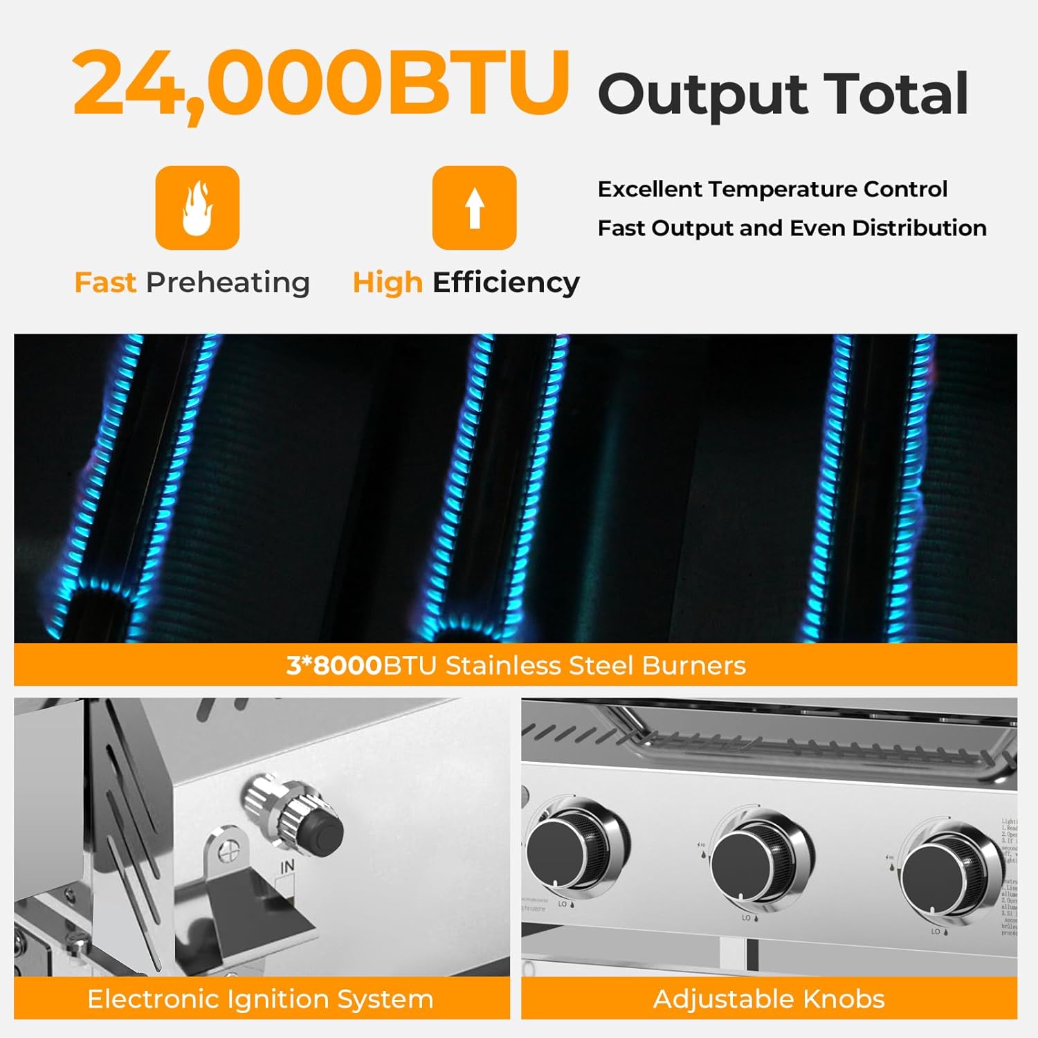 - RAPID & EVEN HEATING: Experience rapid and even heating with 3 tube burners totaling 24,000 BTU, Enamel wire grate and V-shaped flame tamers. Adjust heat levels effortlessly with dual control knobs, ensuring precise temperature control. The gas grill adopts electric ignition to ensure quick and reliable starts.