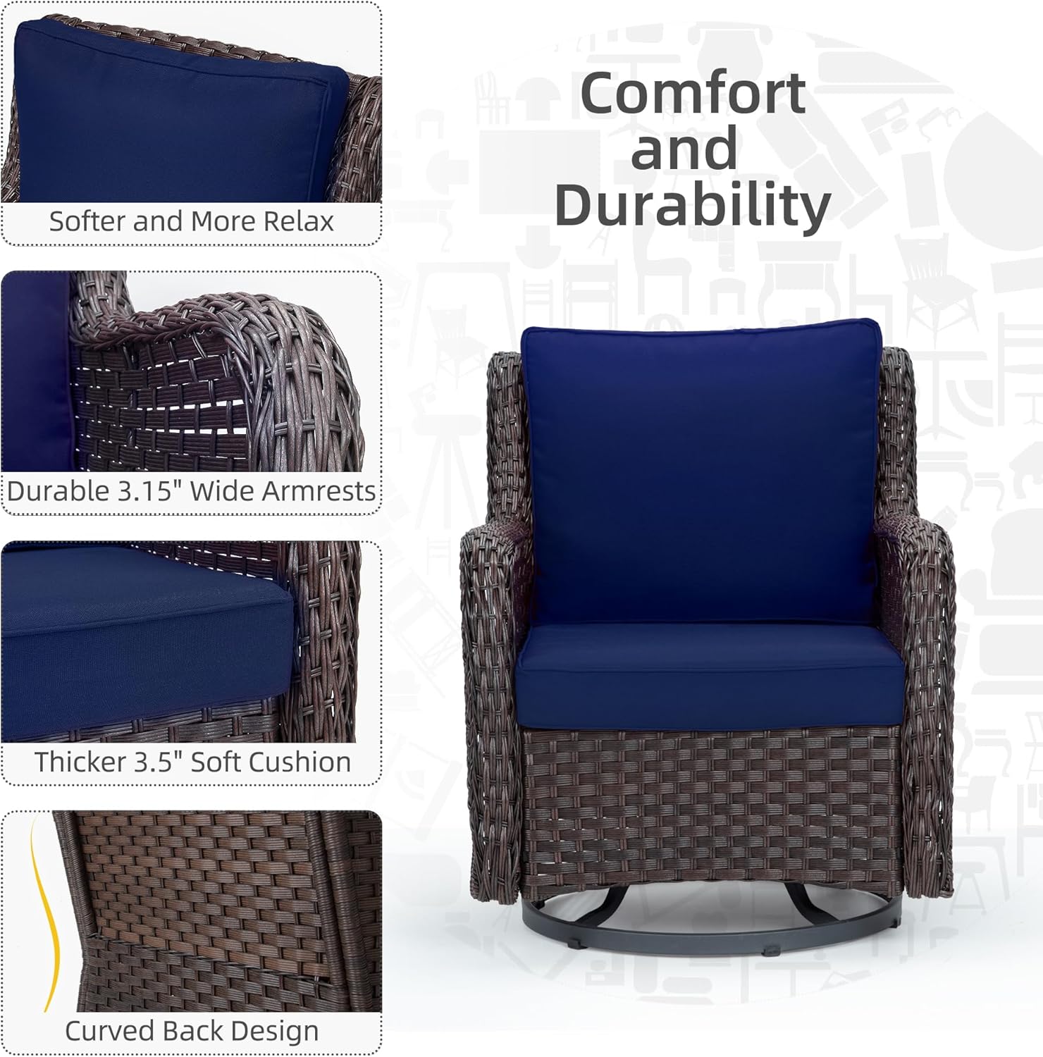 - 360° Swivel and Rocking Function: Outdoor chairs allow you to rotate a full 360 degrees and rock back and forth effortlessly. Whether you want to enjoy a sweeping view or gently sway in the breeze, our swivel rocker patio chair ensures a relaxing experience for both your body and mind