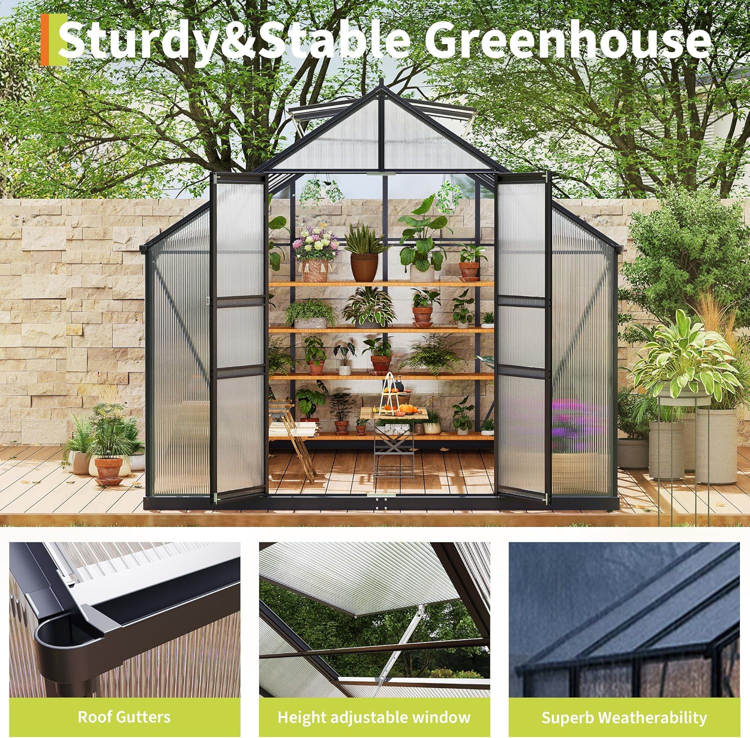 8*14 FT Outdoor Walk-in Greenhouse, Polycarbonate Green House, Heavy Duty Greenhouse with Vented Roof Window, Windproof Aluminum Frame, Suitable for Outside Gardening, Backyard, Patio