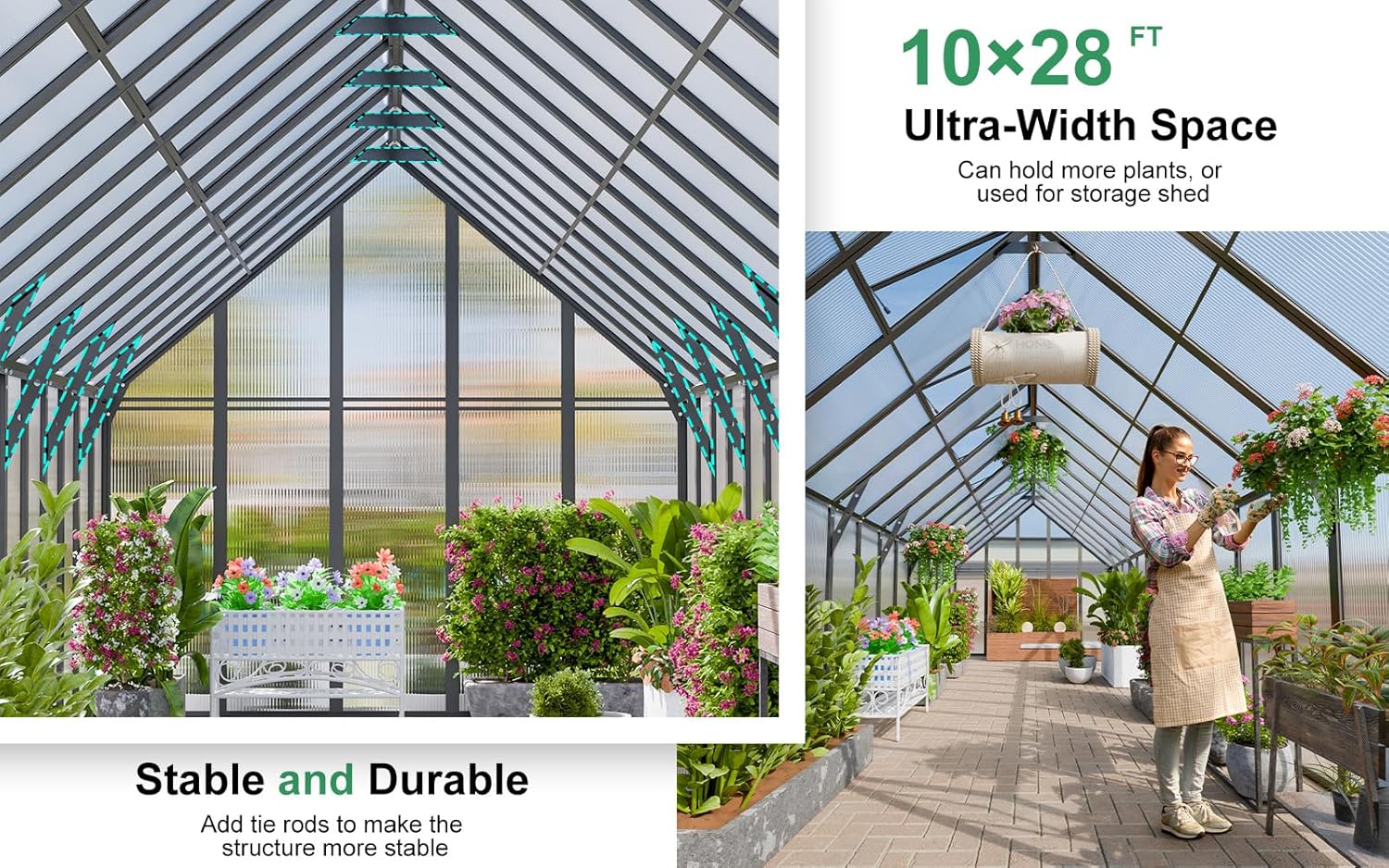 CDCASA 10x28 FT Greenhouse for Outdoors,Large Easy Assembly Thicker Aluminum Polycarbonate Greenhouses w/6 Windows, Double Door, Walk-in Green House for Outside,Patio,Backyard,Garden
