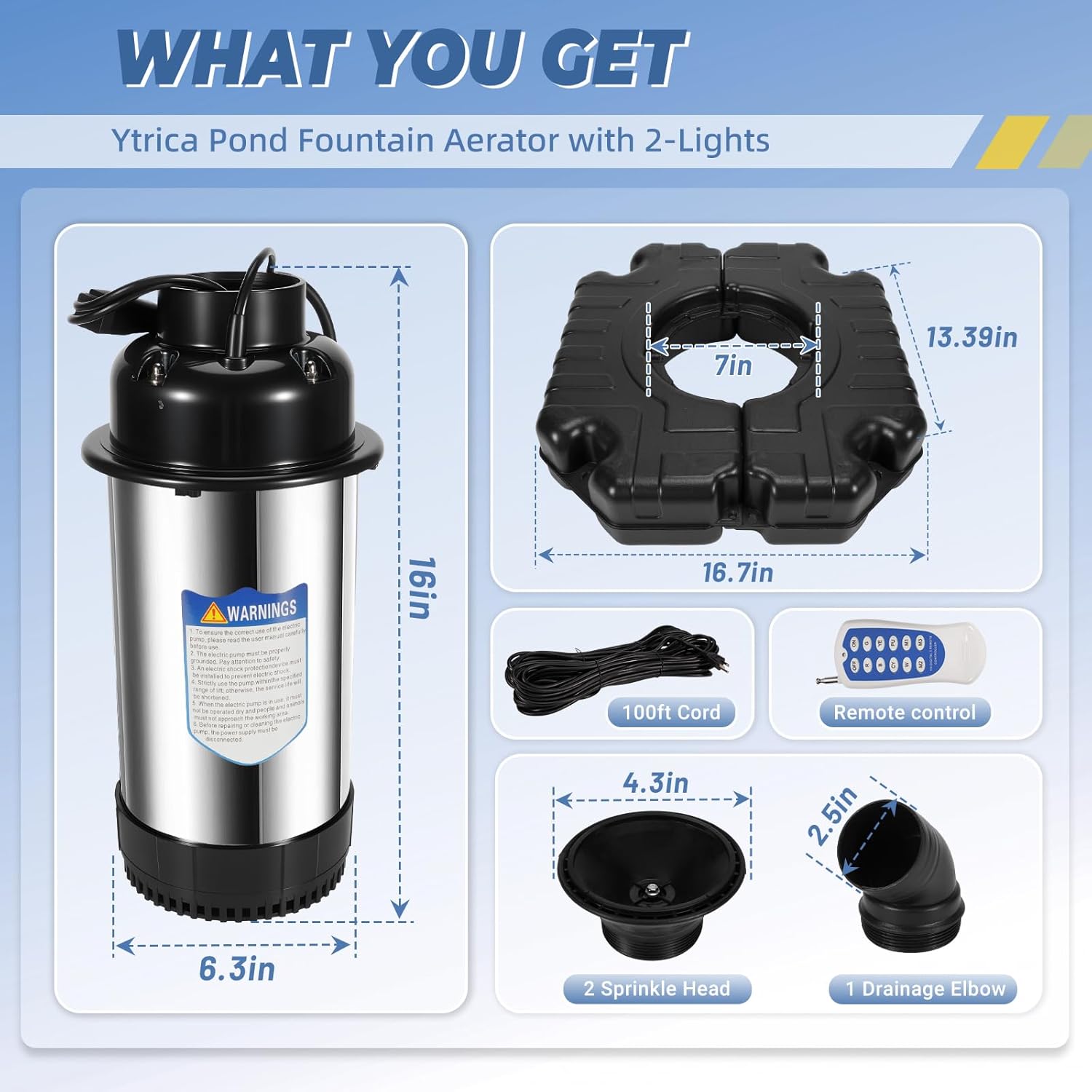 - 【VIBRANT LIGHT SHOW: 2-LIGHTS & REMOTE】Each floating fountain aerator features two powerful 9W LED lights, equipped with seven multi-color light beads, designed to illuminate your pond or lake with stunning visual depth. With the included remote, you can effortlessly control the fountain pump—easily switching between colors and lighting modes.